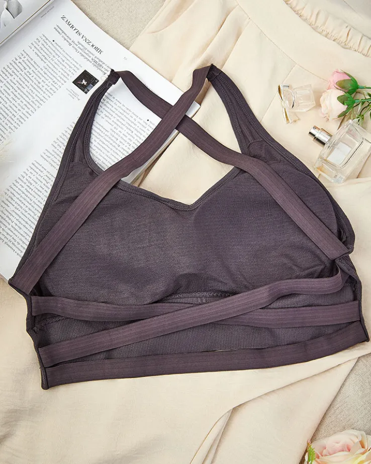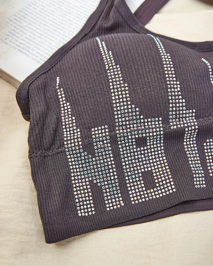 - Sportowy damski biustonosz wykonany z elastycznego, przyjemnego materiału. Model z nieregulowanymi, krzyżowanymi ramiączkami, bez zapięcia i z wyjmowanymi wkładkami, wykończony na dole szeroką gumą i zdobiony cyrkoniami. Idealnie dopasuje się do ciała.