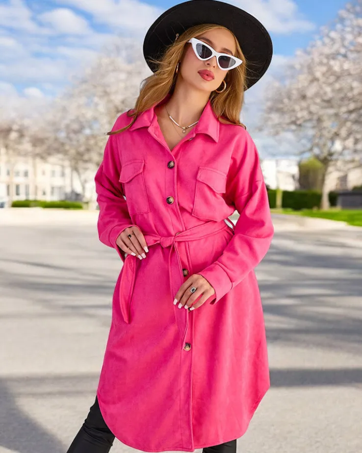 - Stylowy damski płaszcz typu koszula z paskiem. Płaszcz o kroju over size, posiada długie rękawy i zapięcie na guziki. Model z 4 kieszeniami. Świetny na jesień!