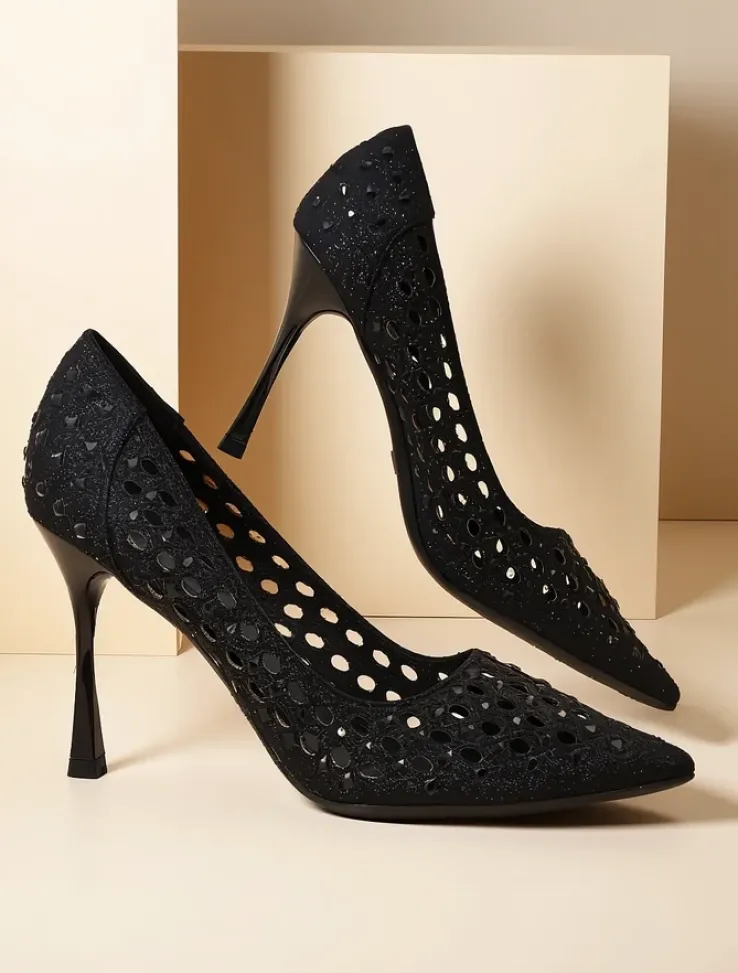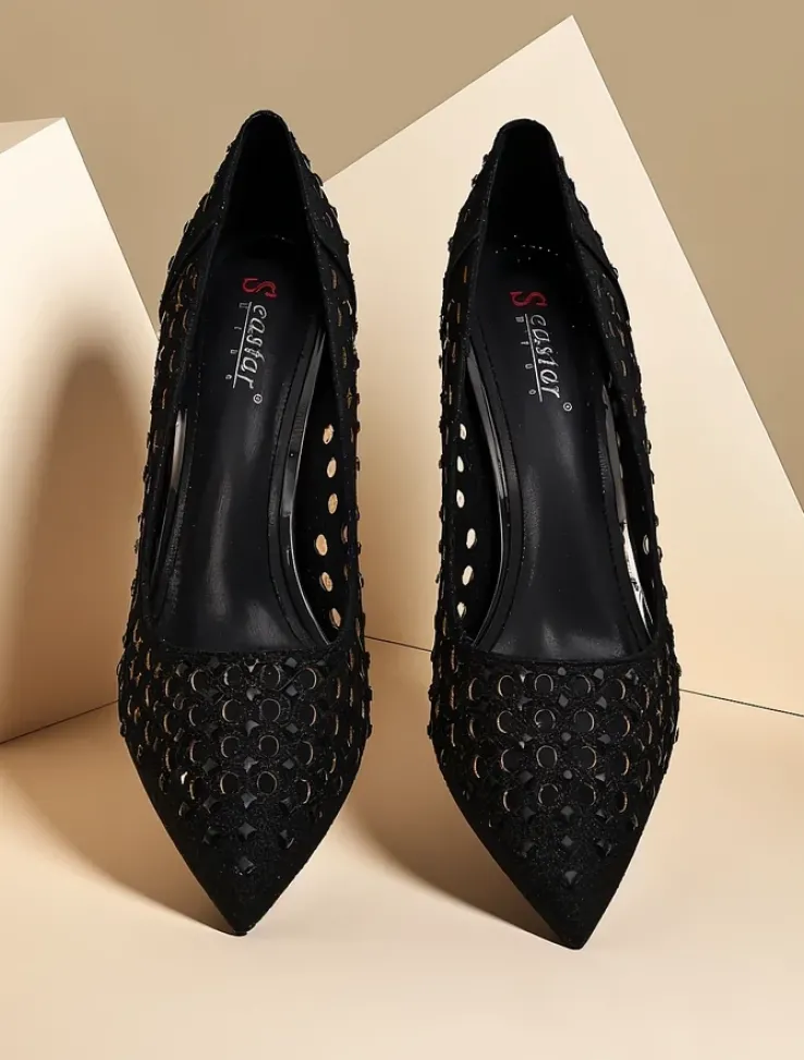 - Eleganckie damskie czółenka na szpilce, wykonane ze skóry ekologicznej. Środek buta jest wyłożony skórą ekologiczną. Nosek w szpic optycznie wyszczupli nogi. Model zdobiony ażurowym wykończeniem, brokatem oraz cyrkoniami!