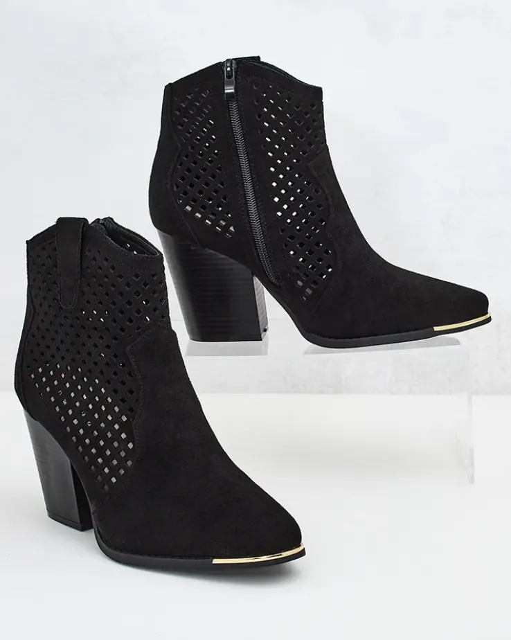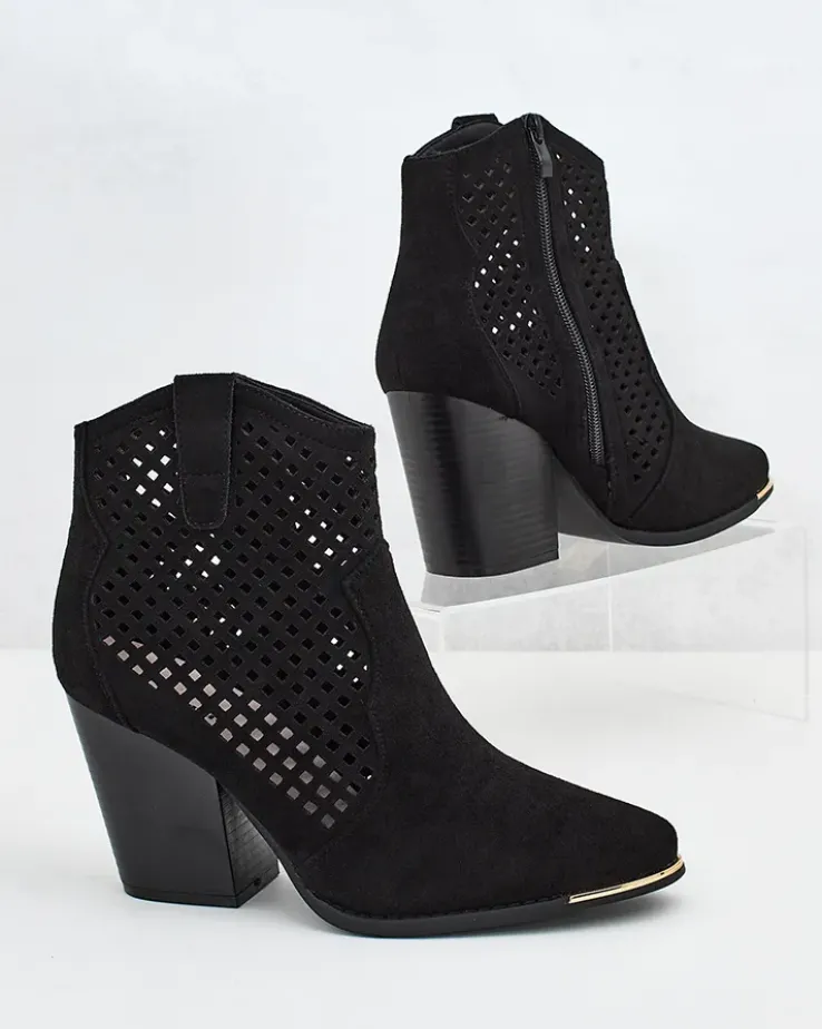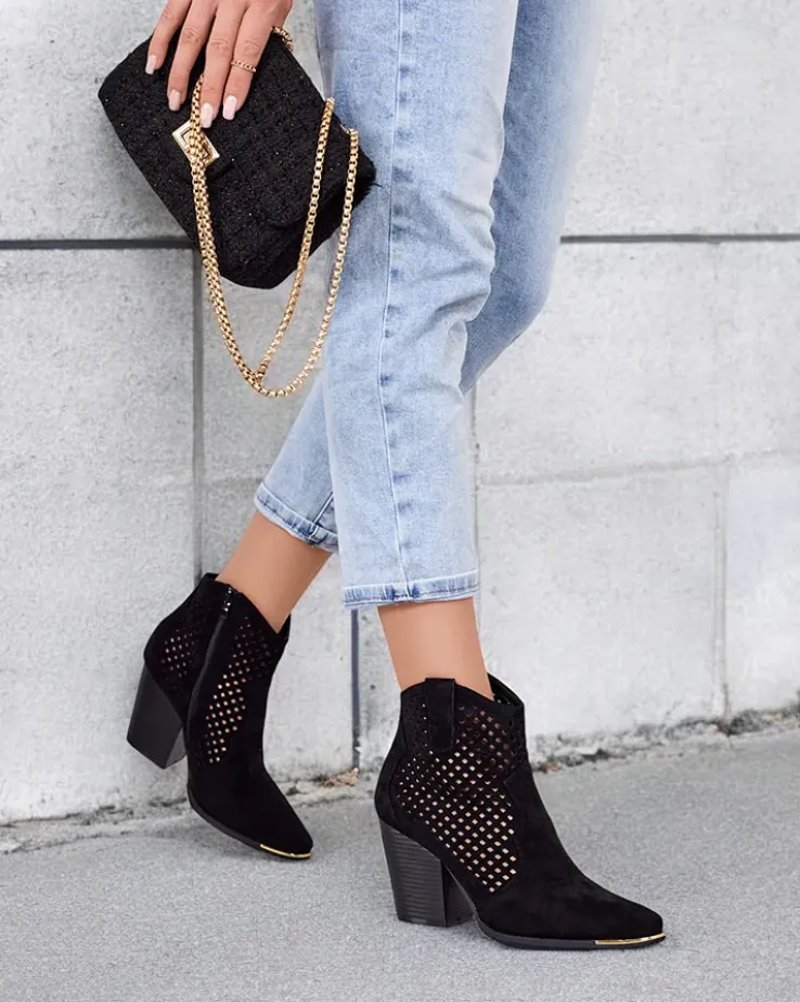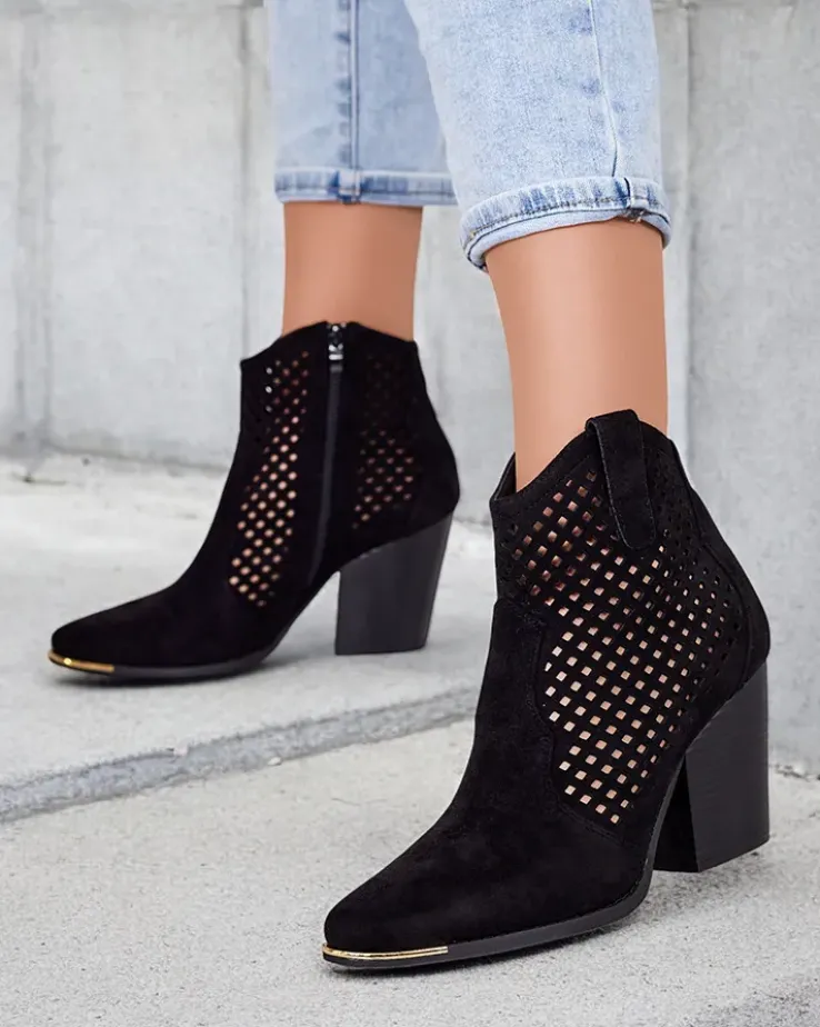 - Stylowe damskie eko zamszowe botki z wkładką z eko skóry to idealne rozwiązanie na chłodniejsze dni. Ażurowa cholewka jest zapinana na suwak. Model z noskiem w szpic oraz na wygodnym słupku co daje lepszy komfort!