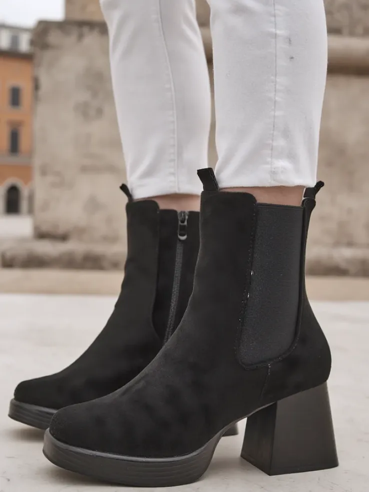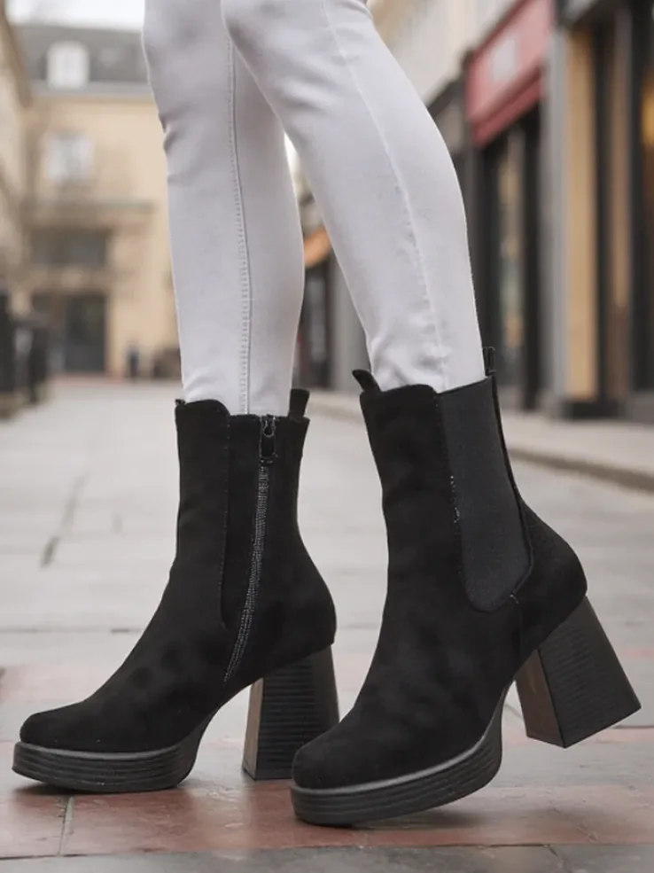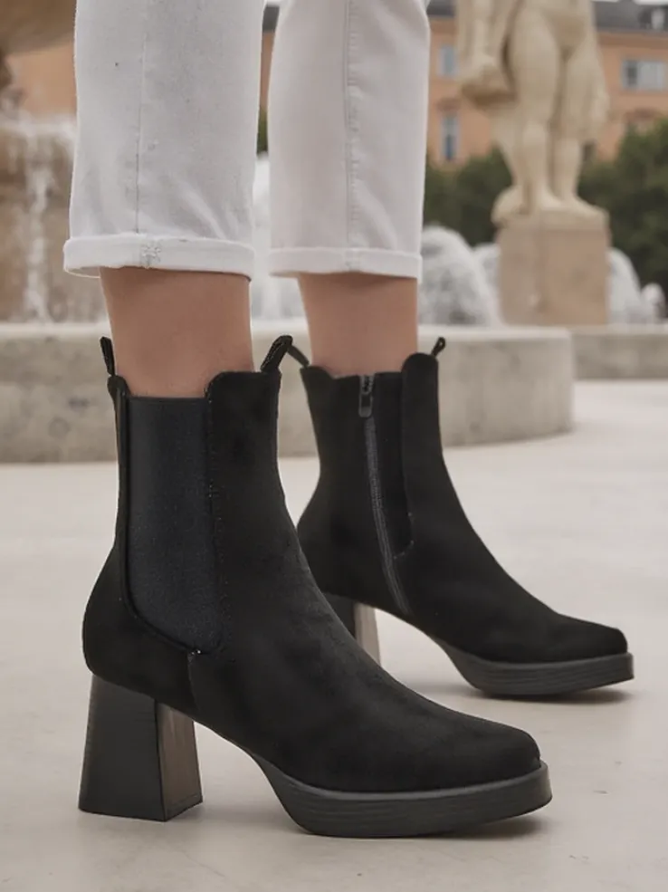 - Stylowe damskie eko-zamszowe botki – to idealne rozwiązanie na chłodniejsze dni. Obuwie zapinane na suwak, posiada eko skórzaną wkładkę. Model z ozdobnym słupkiem oraz kwadratowym noskiem.