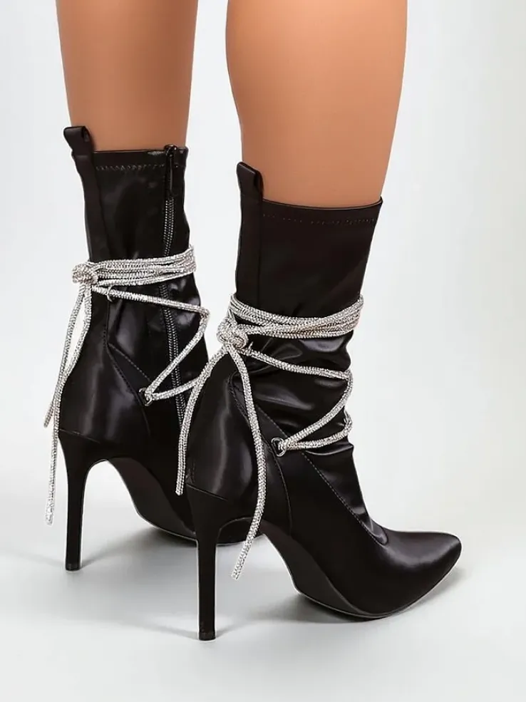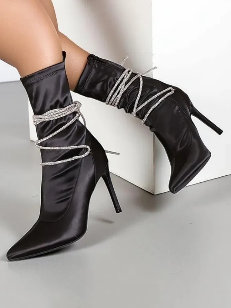 - Eleganckie botki na szpilce wykonane z tkaniny a’la satyna. Nosek zakończony w szpic, cholewka zdobiona cyrkoniami. Zapięcie na suwak. Świetne buty do jesiennych kreacji!