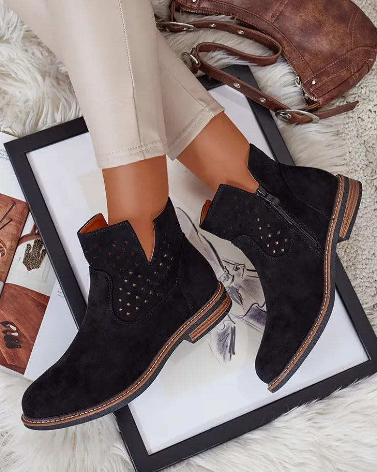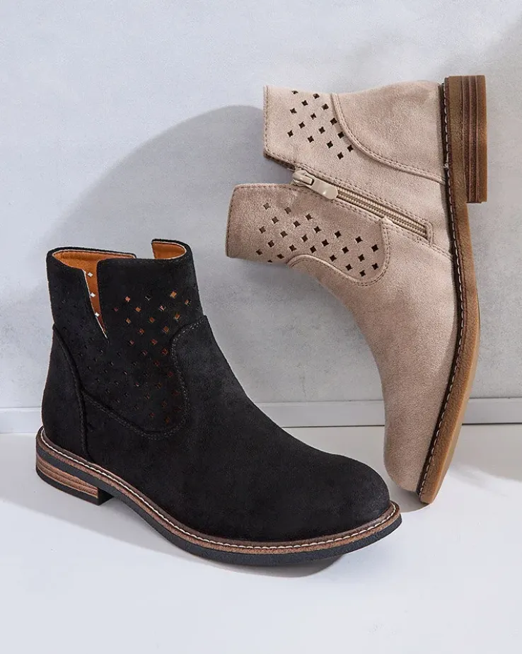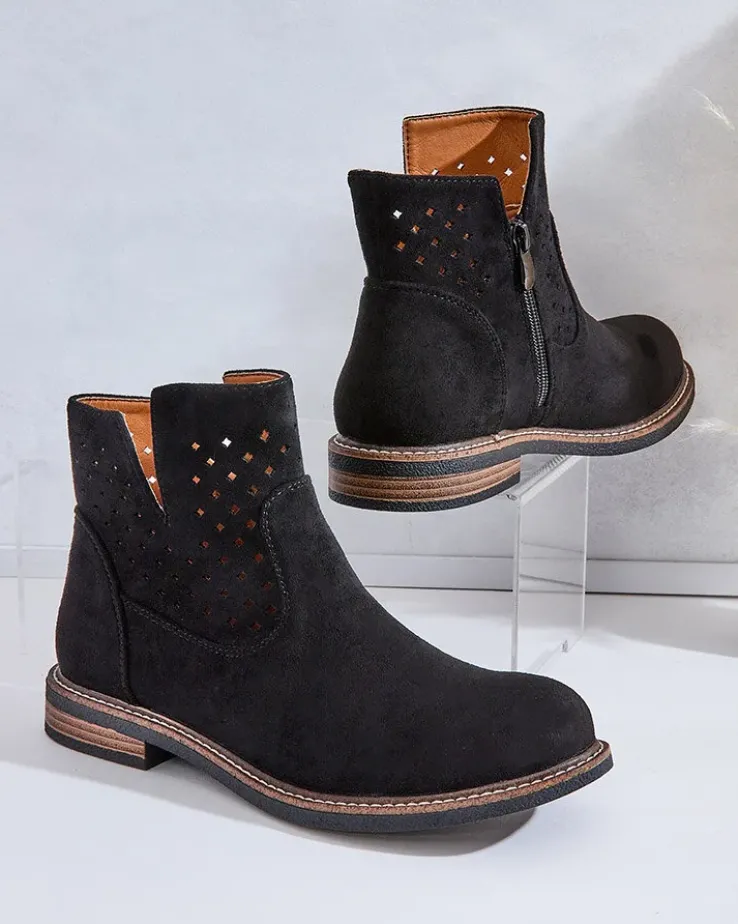 - Stylowe damskie eko zamszowe botki z wkładką ze skóry naturalnej to idealne rozwiązanie na chłodniejsze dni. Cholewka jest zapinana na suwak. Model na płaskim obcasie i z okrągłym noskiem. Super dodatek do Twoich casualowych outfitów!