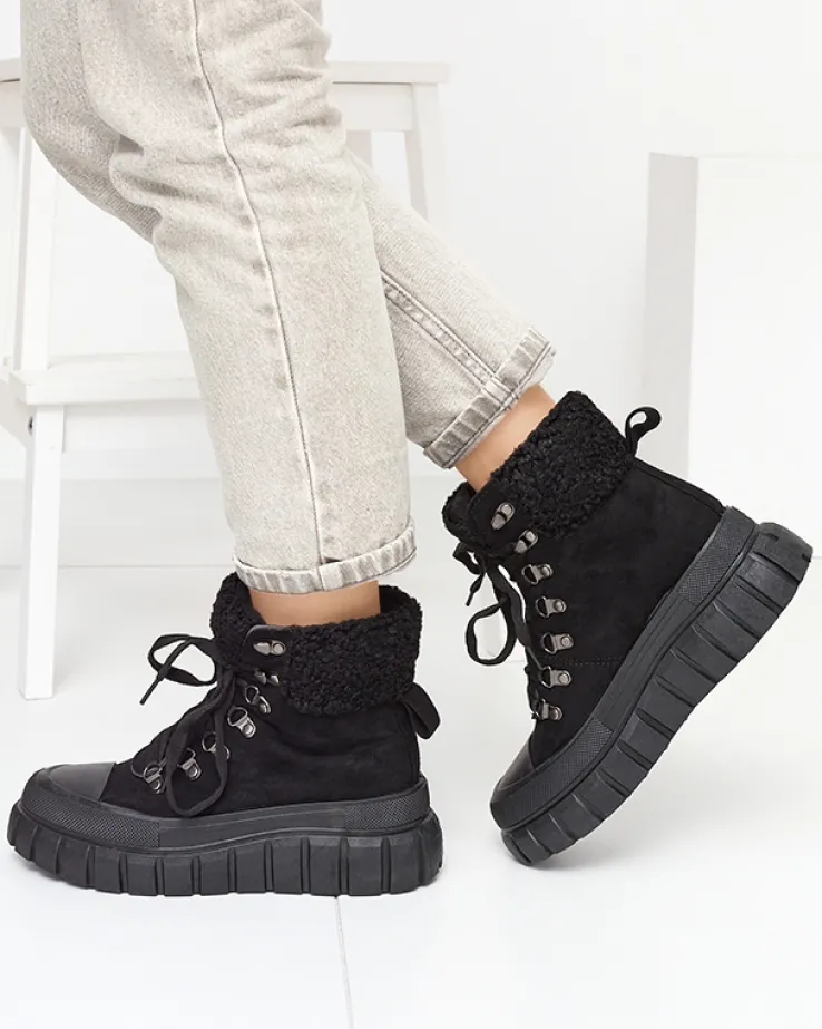 - Super stylowe damskie botki na grubszej podeszwie, wykonane ze skóry eko-zamszowej. Model jest sznurowany, środek wyłożony tkaniną. Cholewka zdobiona kożuszkiem w dopasowanym kolorze. Idealna para na co dzień! CZARNE NIEOCIEPLANE BUTY BOTKI VETIC