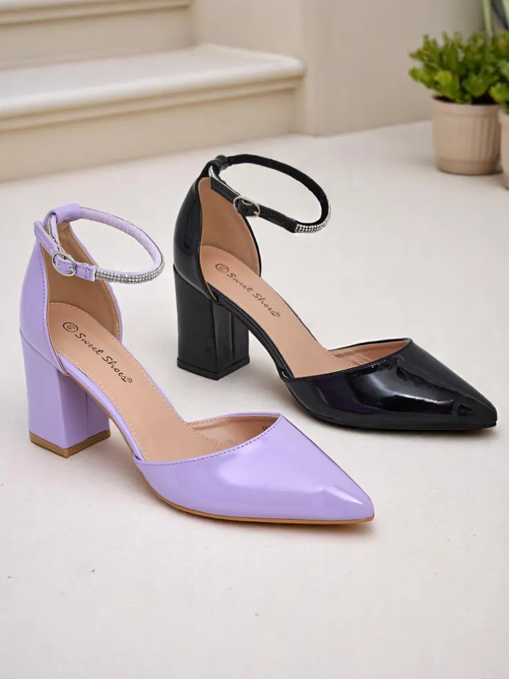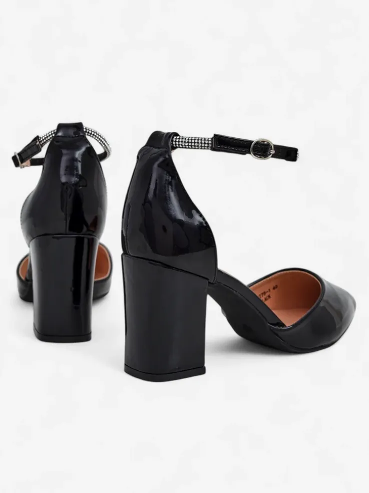 - Eleganckie damskie czółenka na słupku, wykonane ze skóry ekologicznej lakierowanej. Środek buta jest wyłożony skórą ekologiczną, a nosek w szpic nadaje elegancji! Dodatkowo ozdobny paseczek z cyrkoniami!