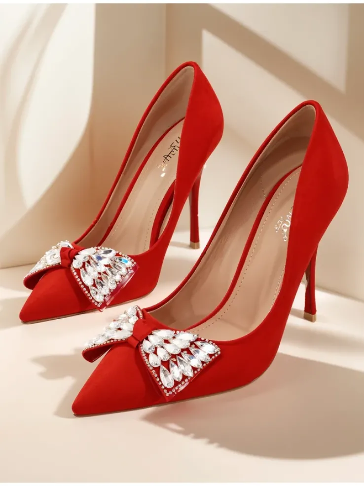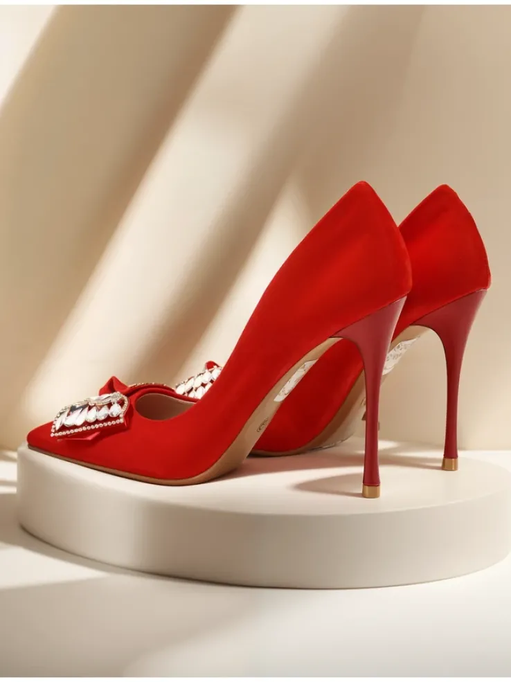 - Eleganckie damskie czółenka na szpilce, wykonane z eko zamszu, zdobione kokardką z cyrkoniami po środku. Środek buta jest wyłożony skórą ekologiczną, a nosek w szpic optycznie wyszczupli nogi.