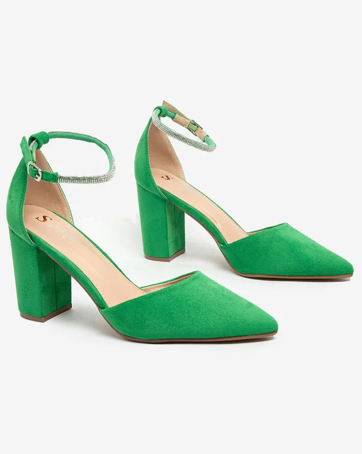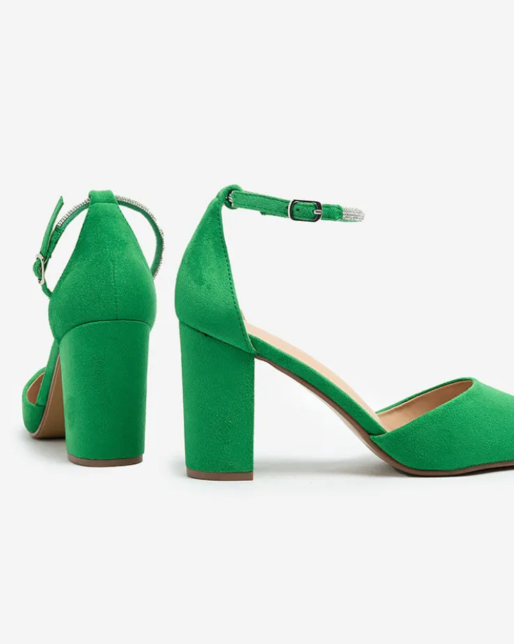 - Przepiękne damskie czółenka na słupku – połączenie klasyki i elegancji z wygodą! Para wykonana jest ze skóry ekologicznej zamszowej. Wkładka eko-skórzana, model zapinany na pasek przy kostce, nosek w szpic. Must have w szafie każdej kobiety!