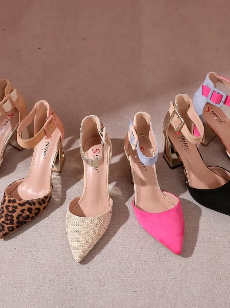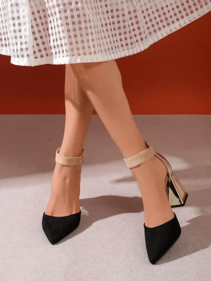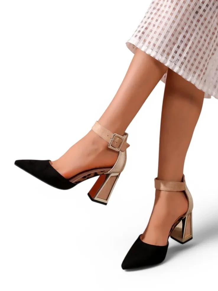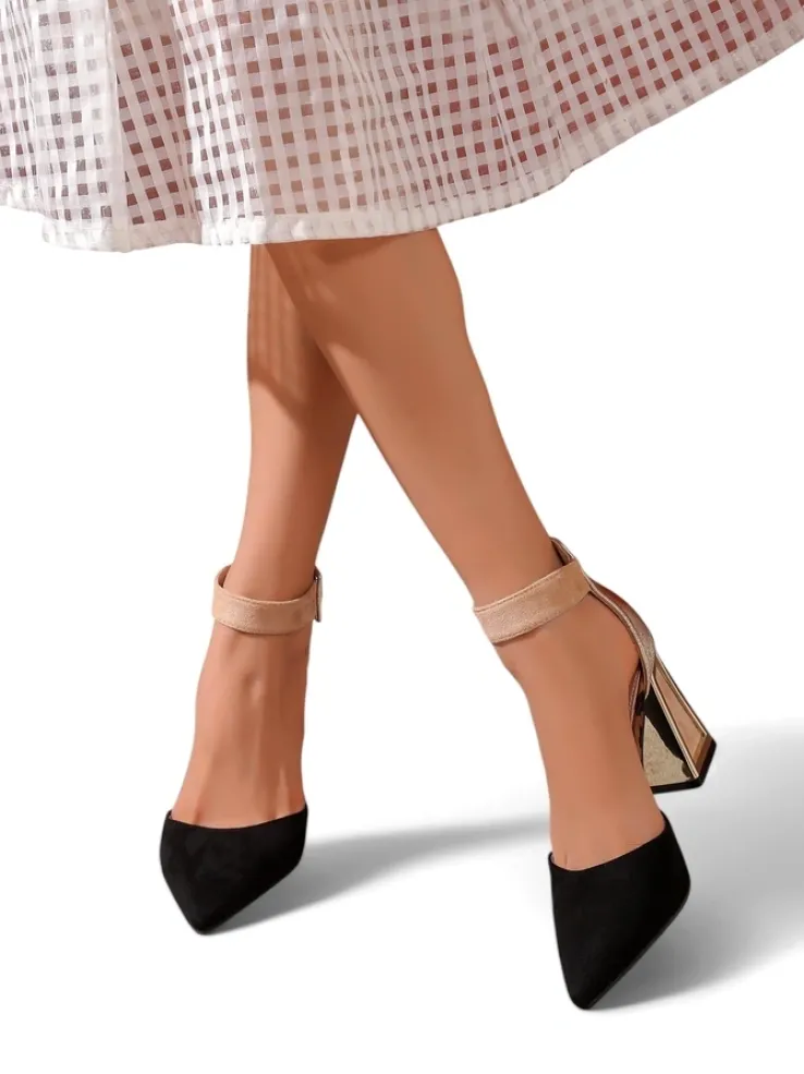 - Eleganckie damskie czółenka na ozdobnym słupku, wykonane z połączenia skóry ekologicznej i eko zamszu. Środek buta jest wyłożony skórą ekologiczną, a nosek spiczasty. Klasa i szyk mody!