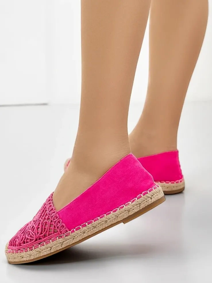 - Damskie ażurowe espadryle są wykonane całościowo z przyjemnej eko skóry zamszowej oraz tkaninowej wkładki. Płaska podeszwa zdobiona sznurkiem jutowym zapewnia wygodę. Doskonały dodatek do letnich stylówek!