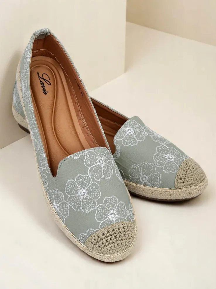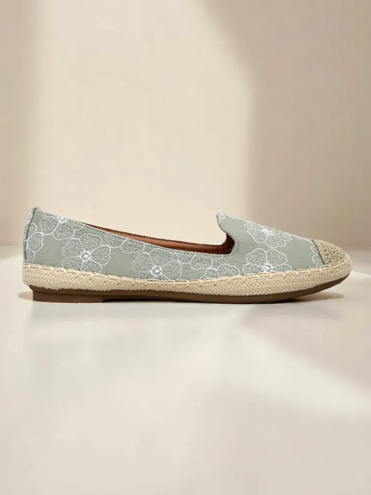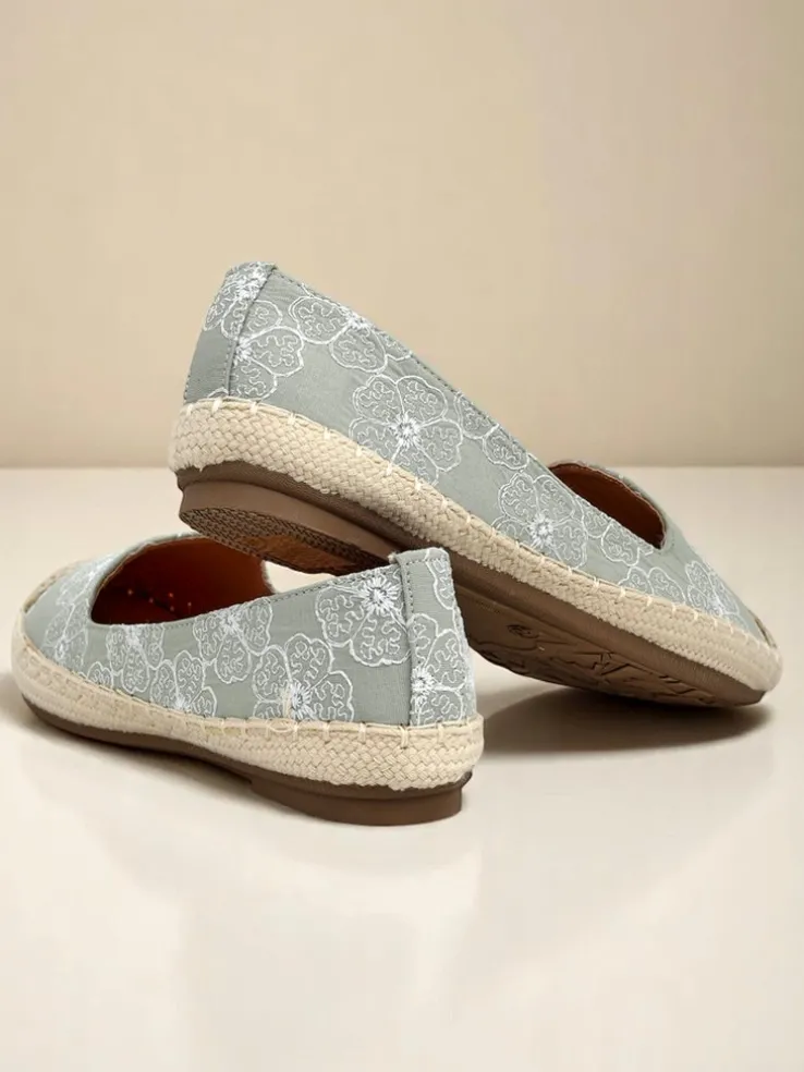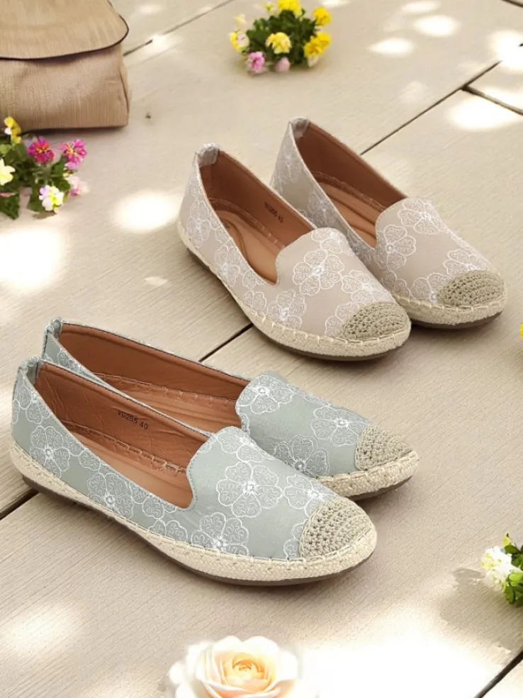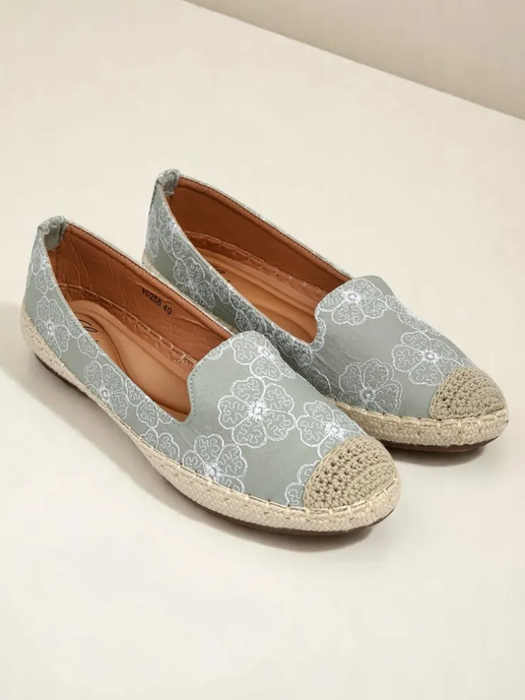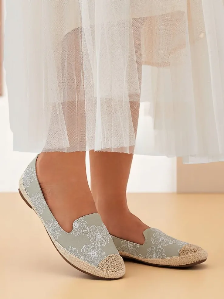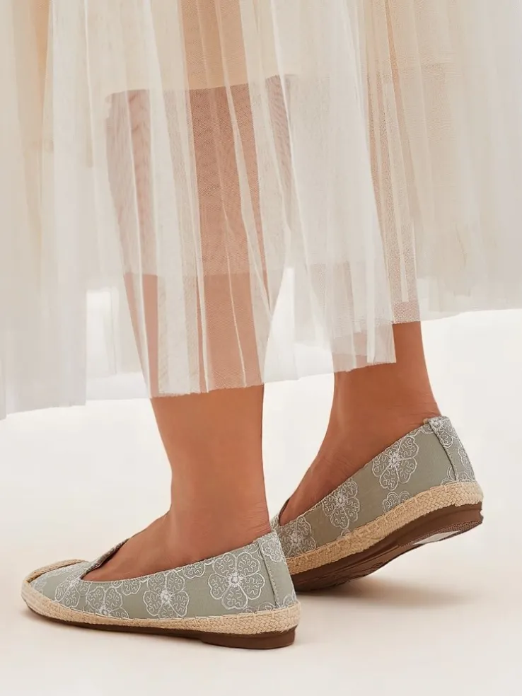 - Espadryle z tkaniny z haftowanymi kwiatami, miękką wkładką z poduszeczkami i jutową podeszwą. Naturalny styl i komfort na każdy krok!