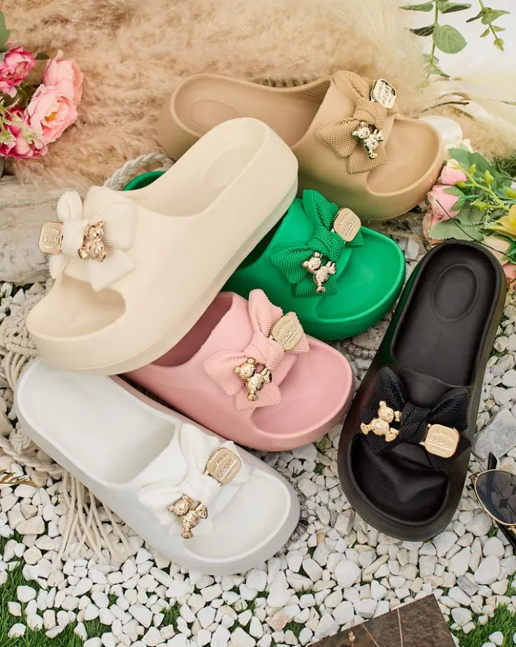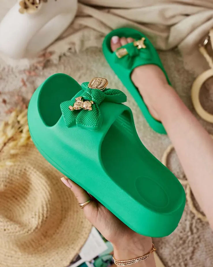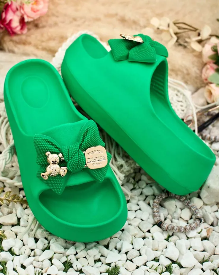 - Świetne damskie gumowe klapki na platformie. Posiadają na cholewce ozdobną kokardę. Idealny wybór na wakacje!