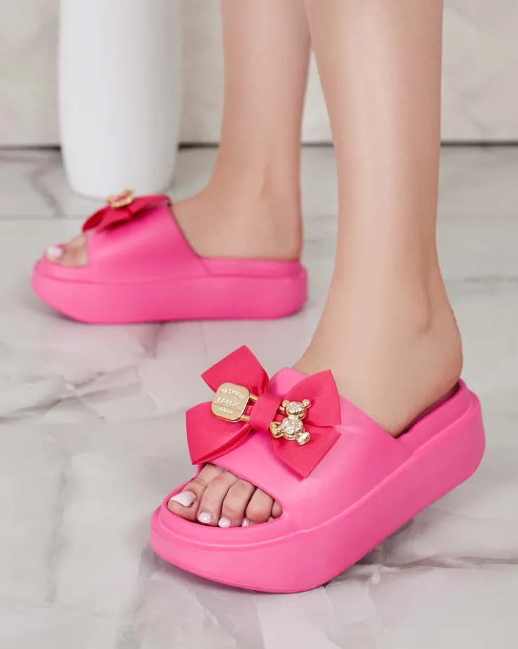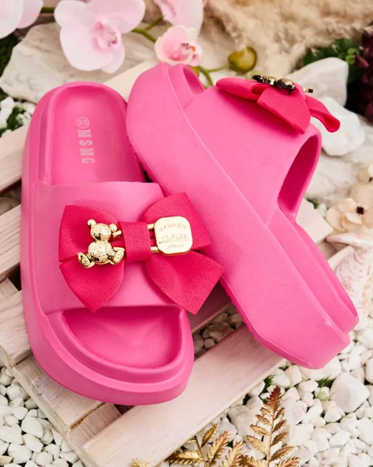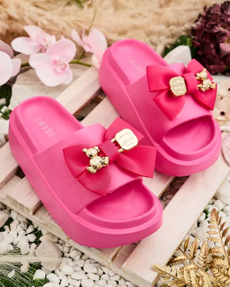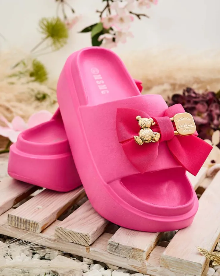 - Świetne damskie gumowe klapki na platformie. Posiadają na cholewce ozdobną kokardę. Idealny wybór na wakacje!