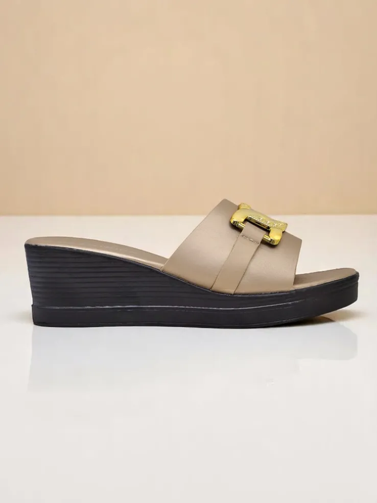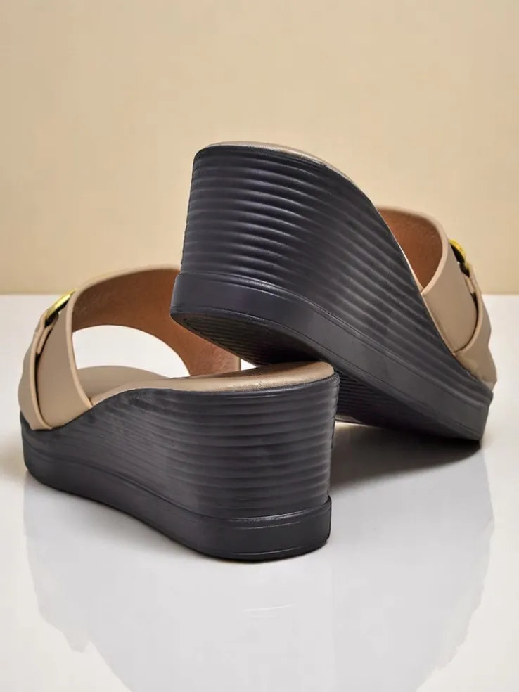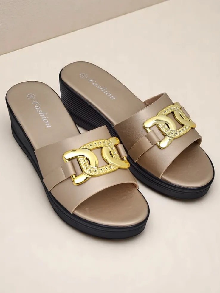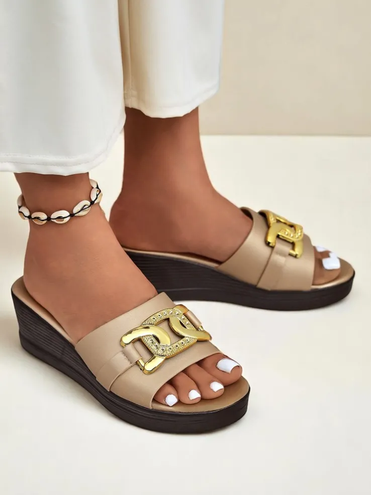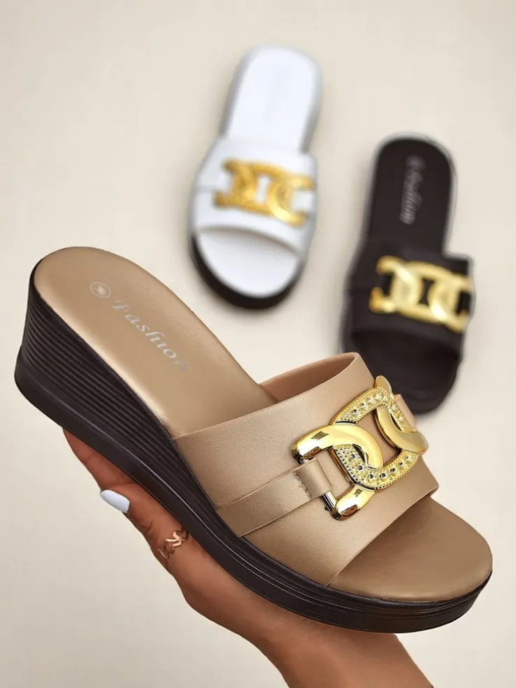 - Nolia to stylowe klapki z eko skóry na koturnie, z metalicznym wykończeniem i subtelną złotą ozdobą. Idealne na lato – łączą elegancję z wygodą na co dzień.