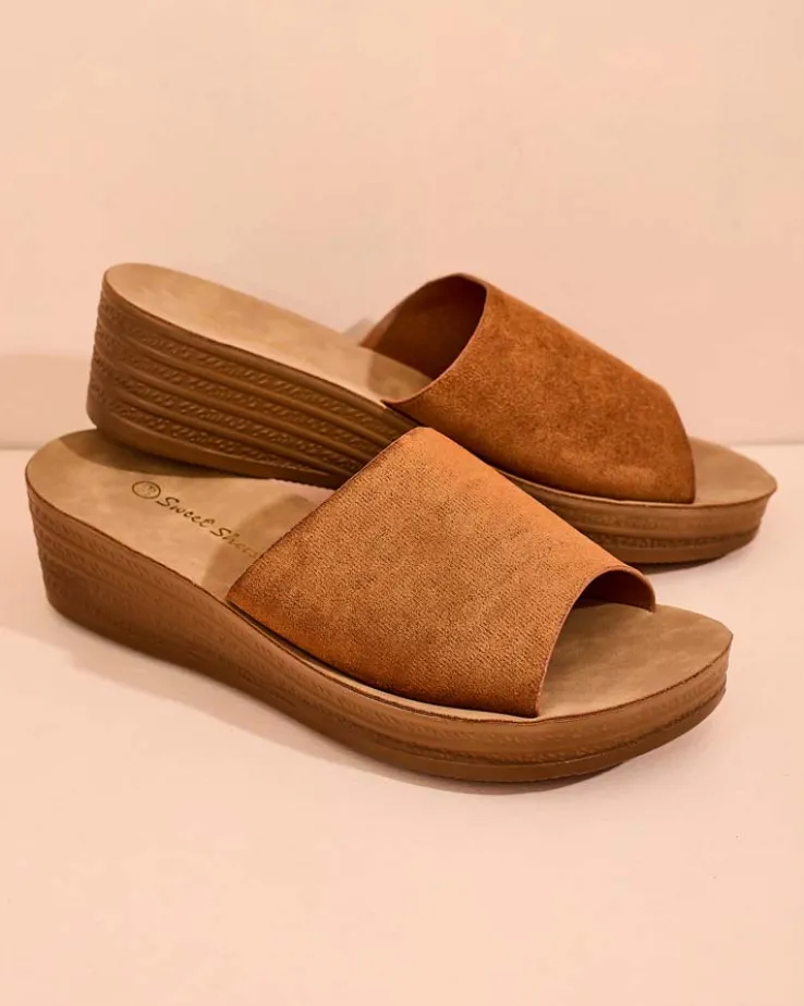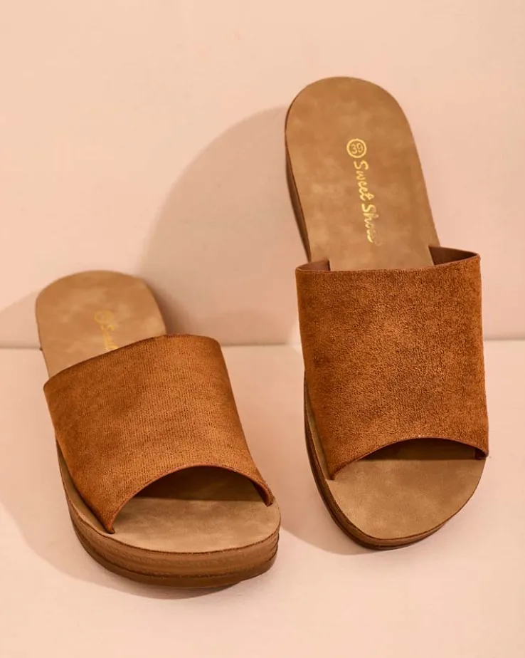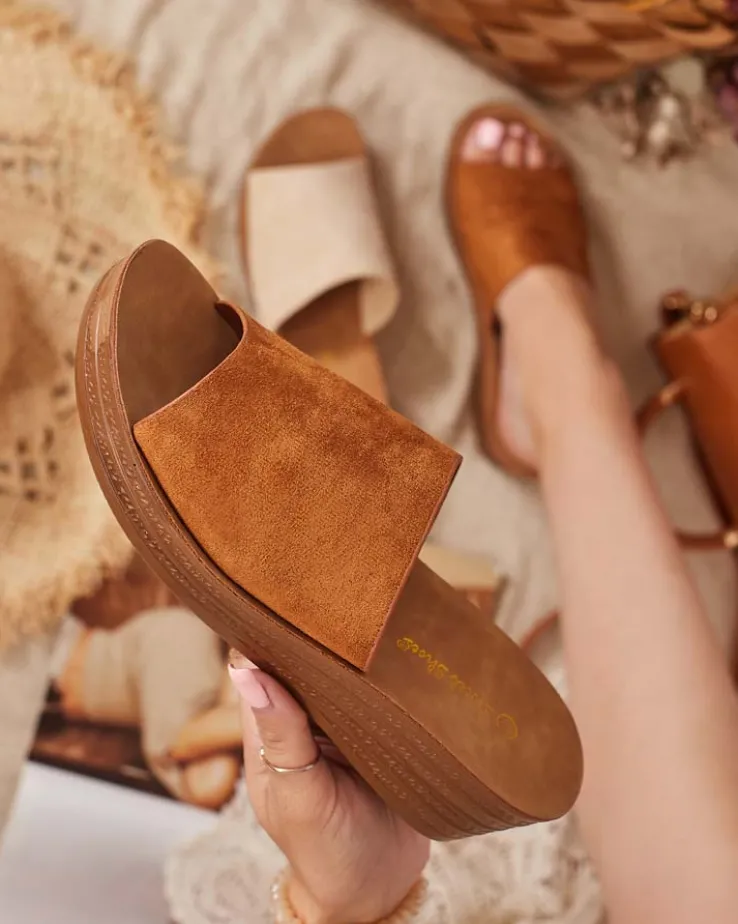 - Klapki damskie wykonane z zamszowej eko skóry i eko skórzanej wkładki. Niski koturn i platforma dodaje uroku i charakteru. Ciesz się wygodą i stylem zabierając te obuwie na wakacje!