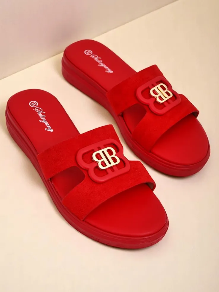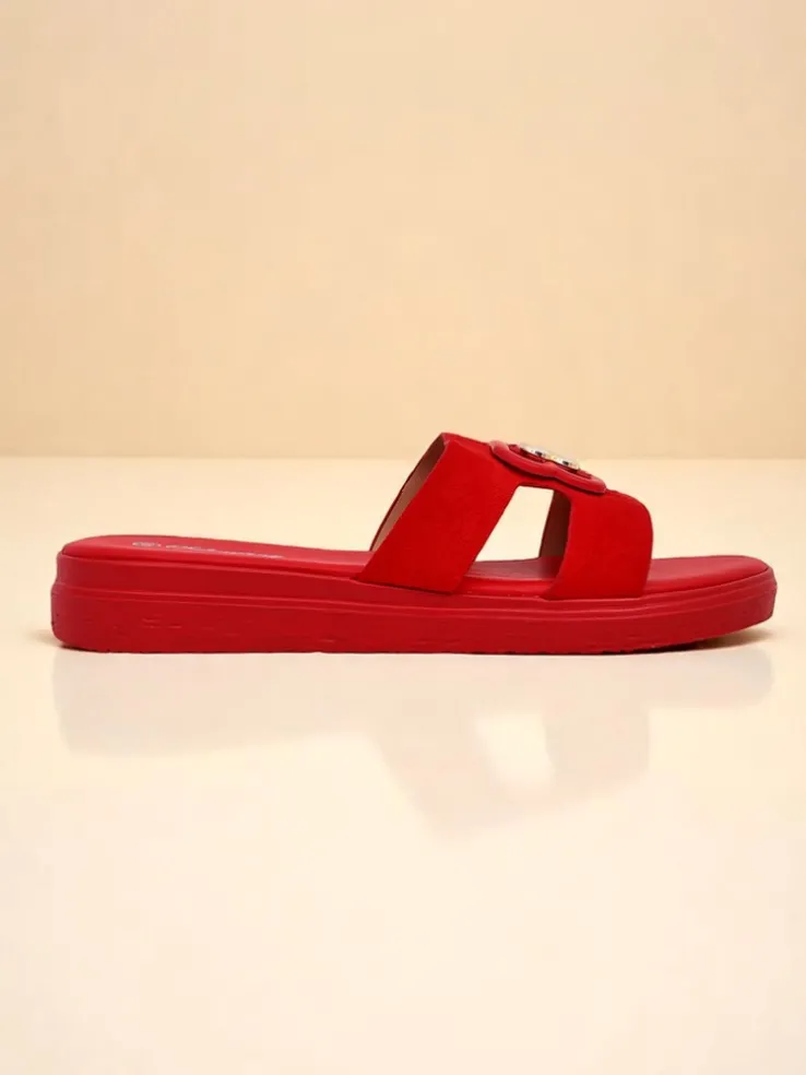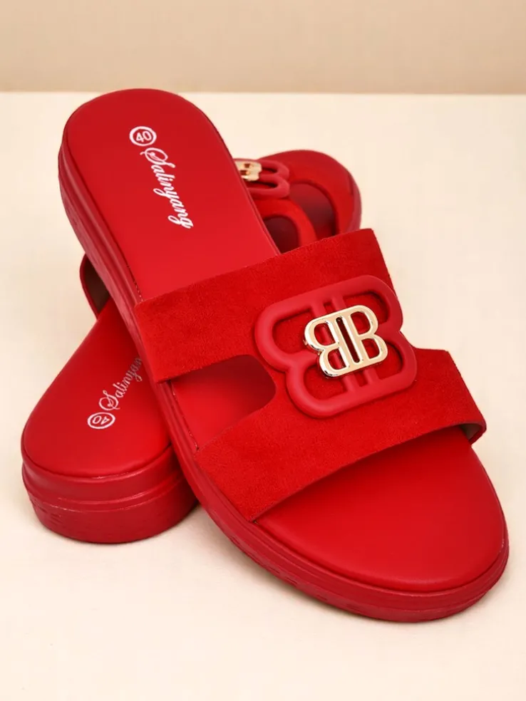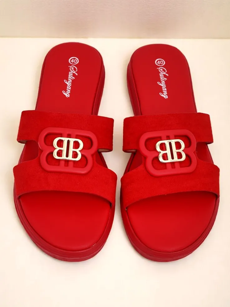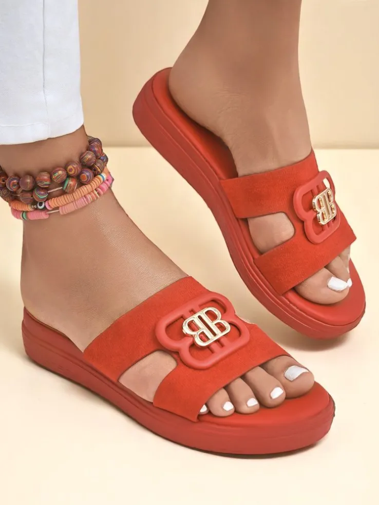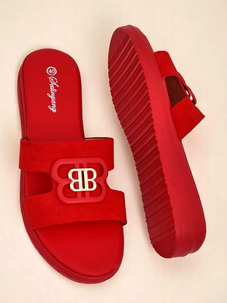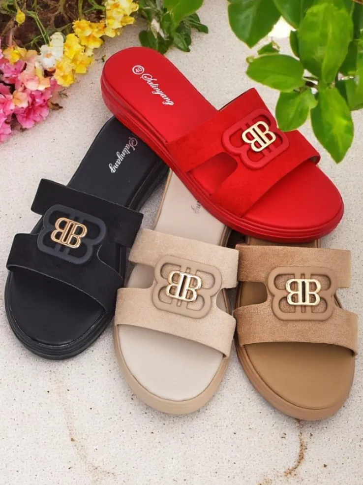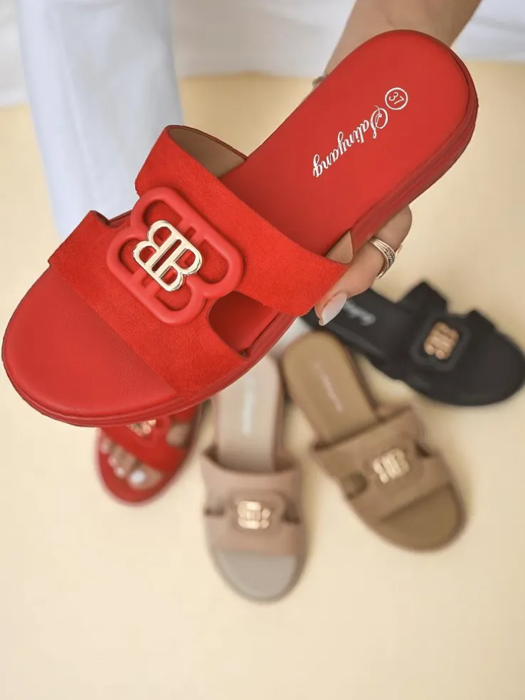 - Stylowe, płaskie klapki z eko zamszu z eko skórzaną wkładką. Na nosku ozdobione elegancką plastikową aplikacją. Komfort i szyk idealny na letnie dni.