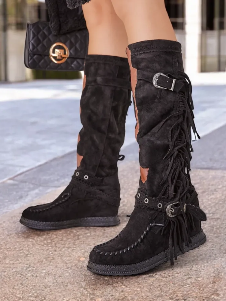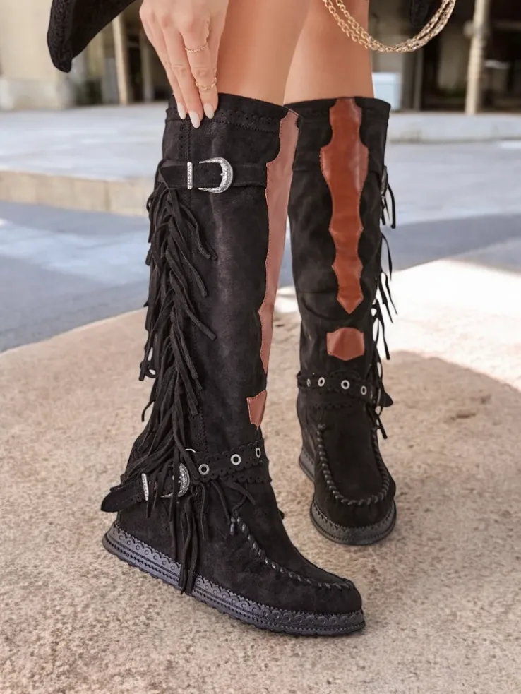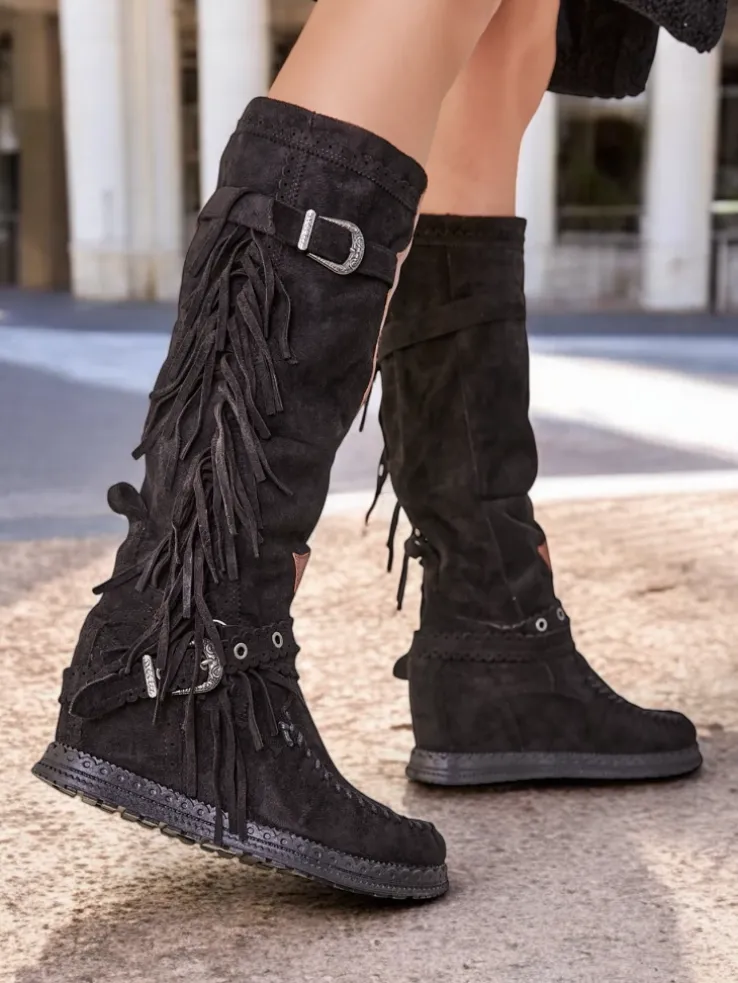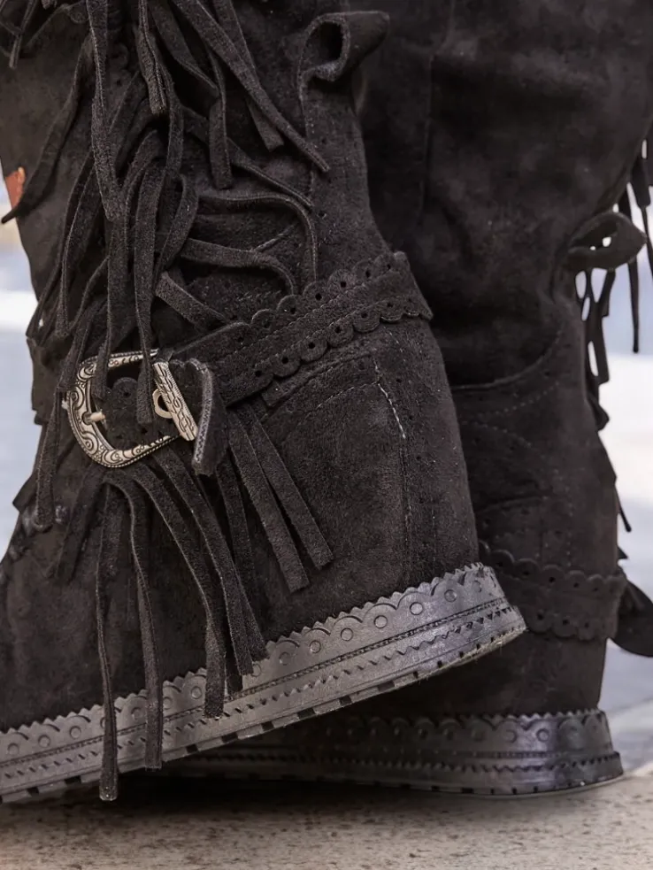 - Kozaki na ukrytym koturnie, wykonane z eko skóry zamszowej. Model posiada ozdobne frędzle. Obuwie wsuwane, posiada futerkowe wypełnienie. Pasują do wielu kobiecych stylizacji!