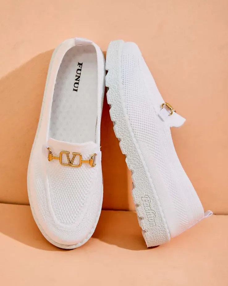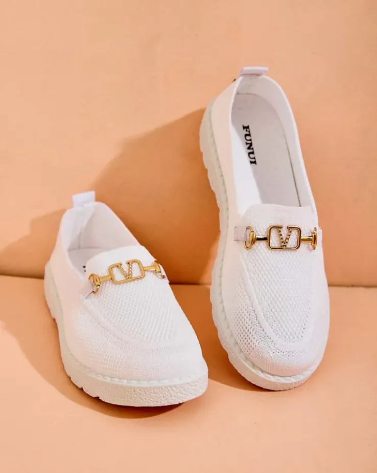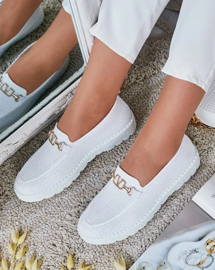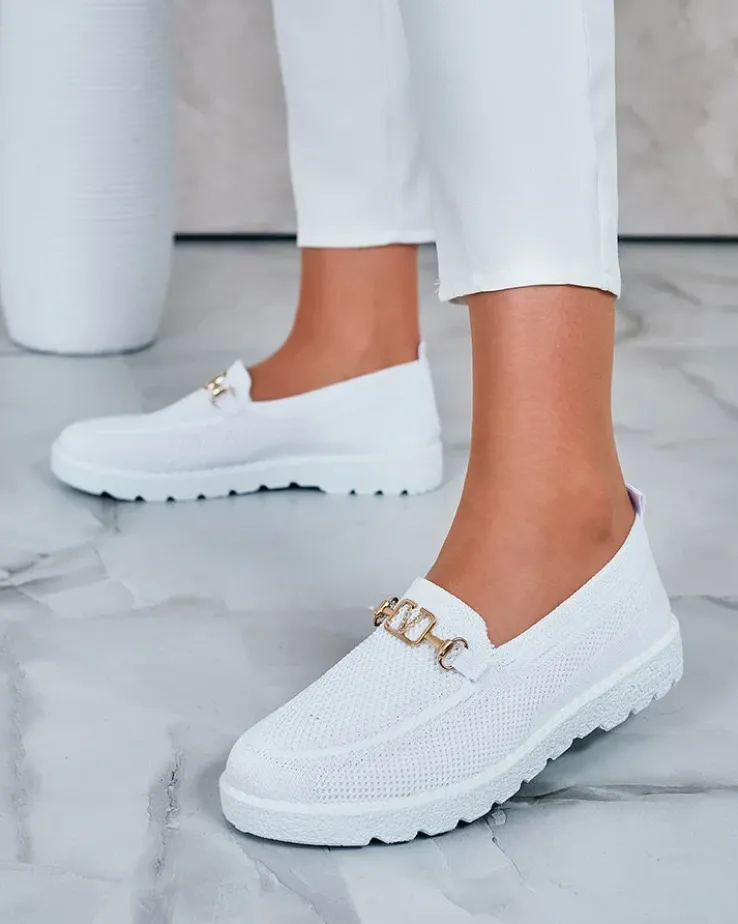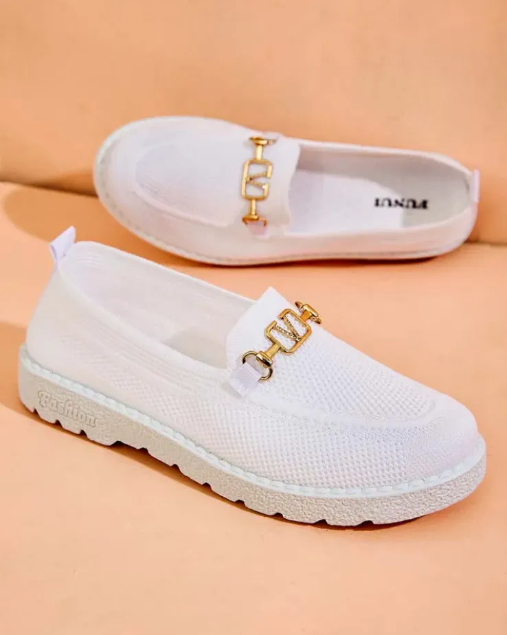 - Wygodne damskie mokasyny w stylu sportowego szyku. Cholewka wykonana z materiału tkaninowego, wkładka to również tkanina. Nosek udekorowany złotą, metalową ozdobą z cyrkoniami. Będą świetną ozdobą do codziennych stylizacji.