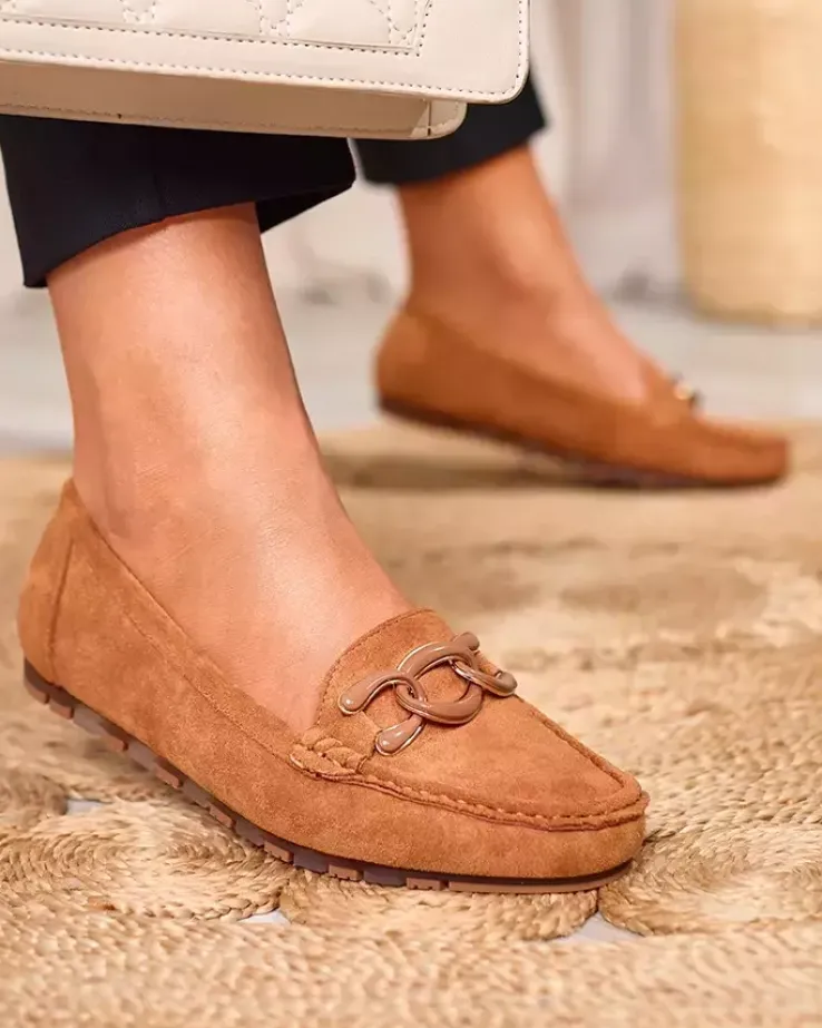 Royalfashion Damskie mokasyny w kolorze camel z łańcuszkiem Lertika