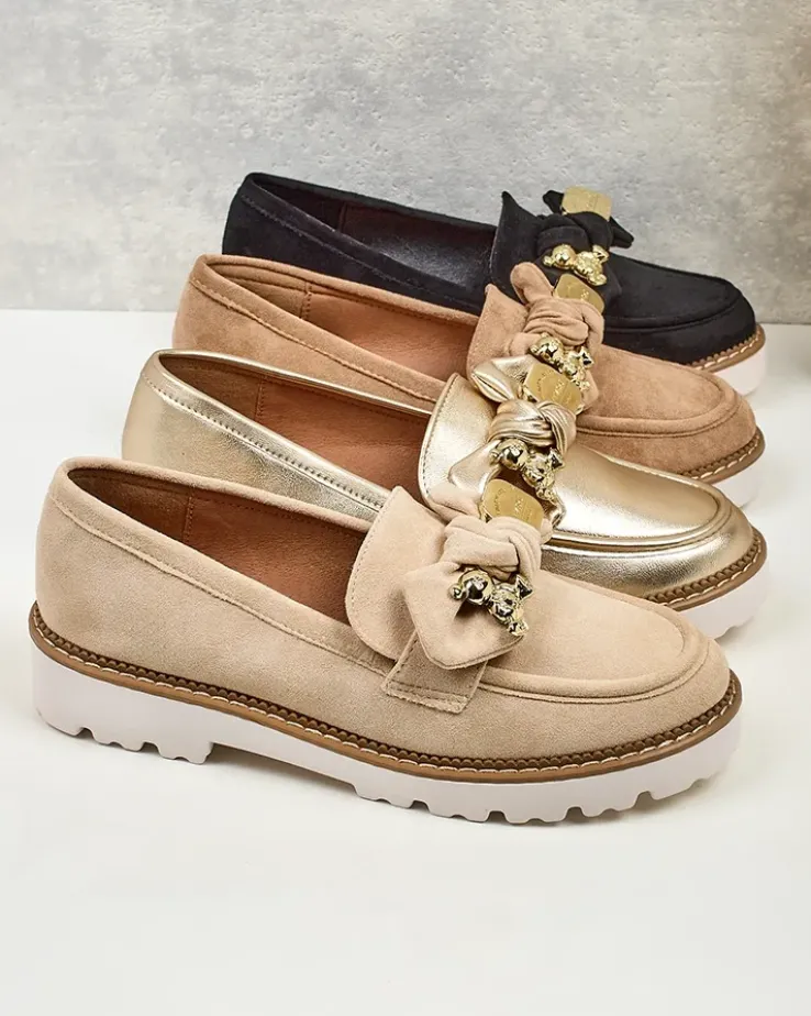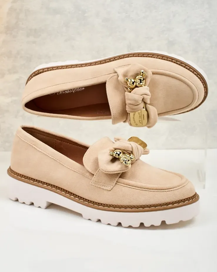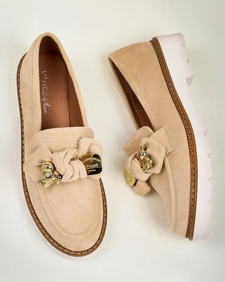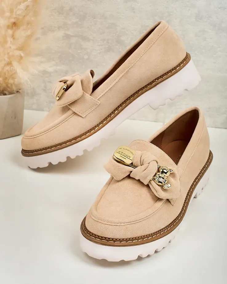 - Klasyczne damskie półbuty typu mokasyny na niewielkiej platformie. Model wykonany ze skóry ekologicznej zamszowej oraz eko skórzanej wkładki. Nosek zdobiony kokardką. Must have w szafie każdej kobiety!