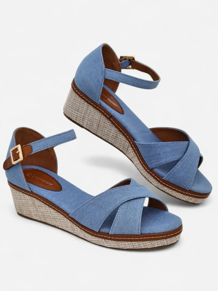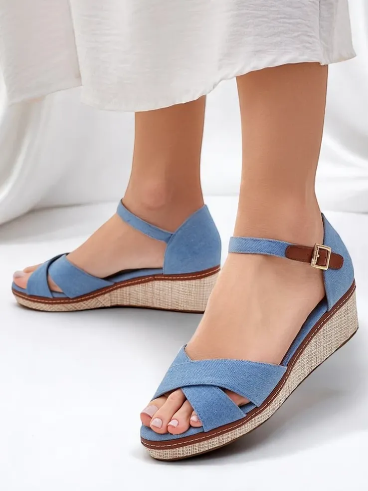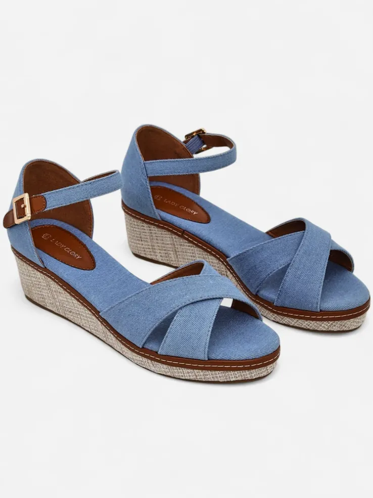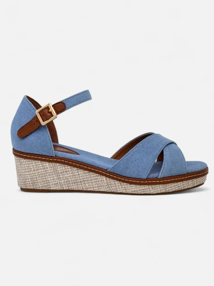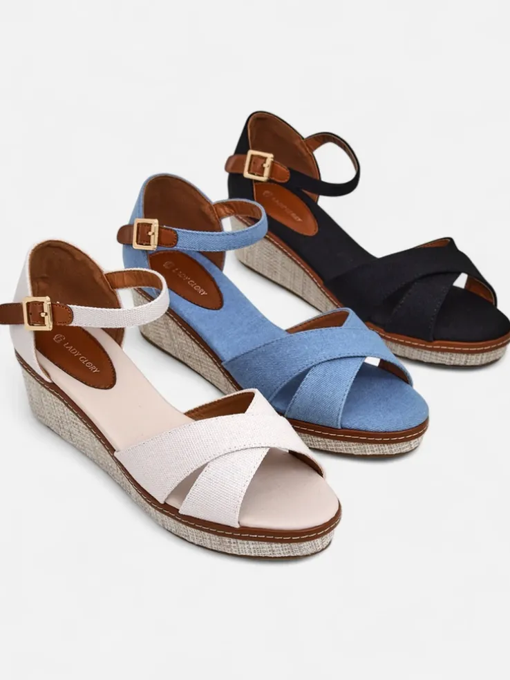 - Damskie sandały na koturnie wykonane z tkaniny. Obuwie posiada zapięcie na sprzączkę. Must have tego sezonu!