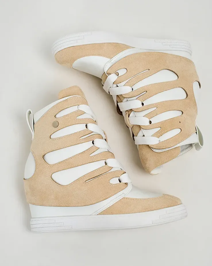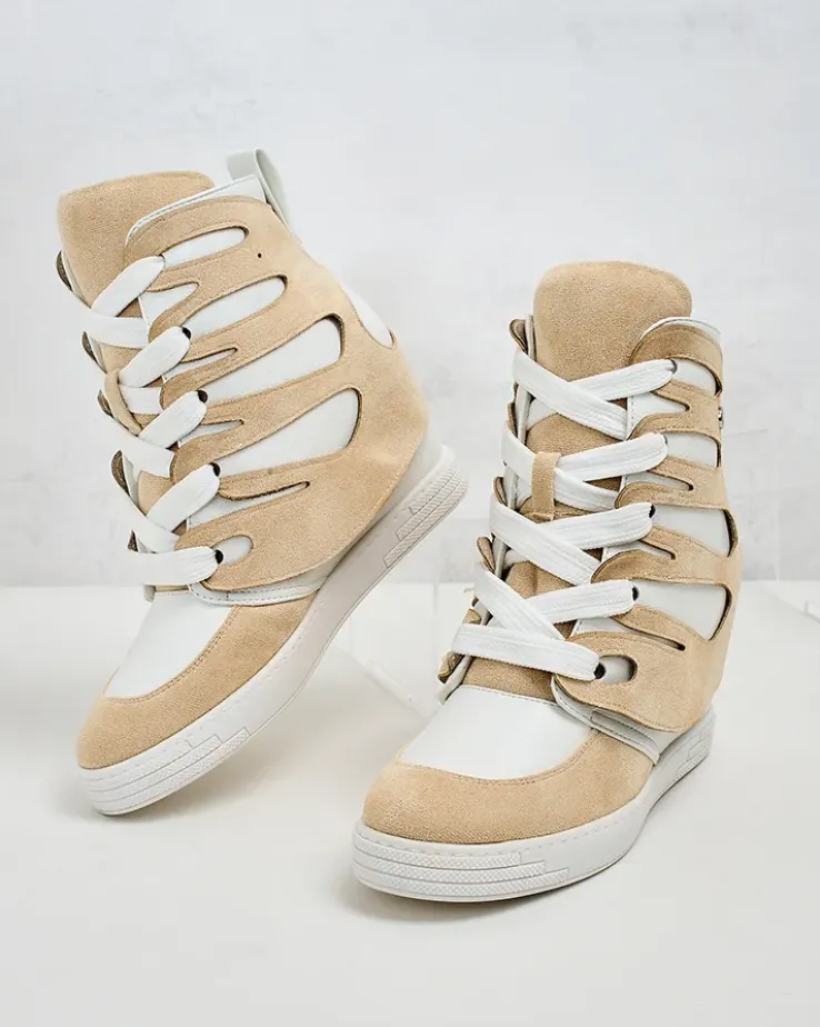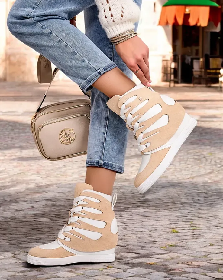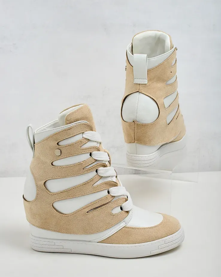 - Sportowe damskie botki na koturnie, wykonane z eko skóry. Obuwie wiązane sznurówkami, w środku tkaninowa wkładka.