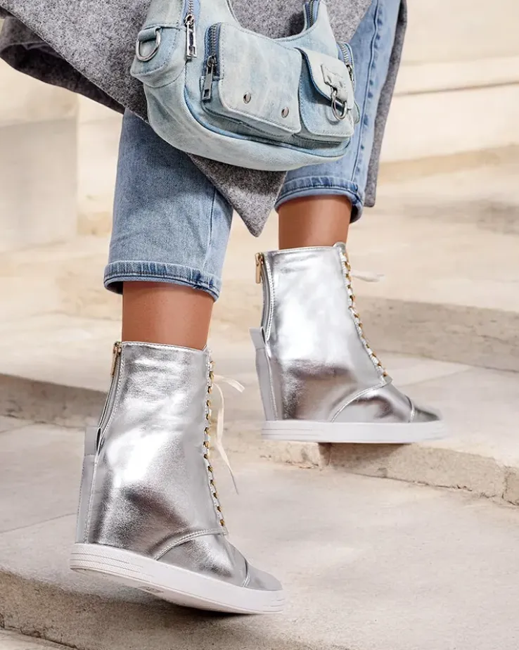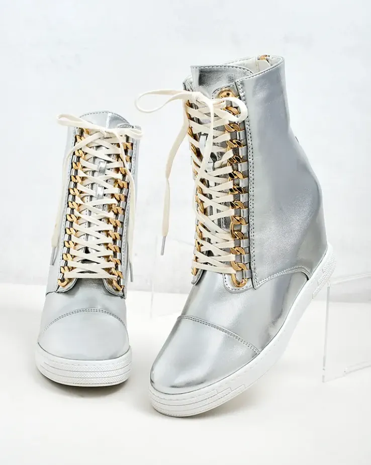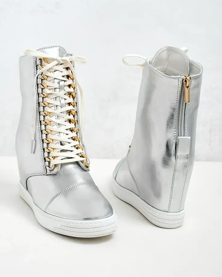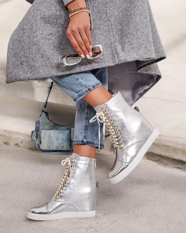 - Sportowe damskie botki na koturnie, wykonane ze skóry ekologicznej. Obuwie wiązane sznurówkami, z tyłu posiadają suwak. Idealne do tworzenia stylowych outfitów!