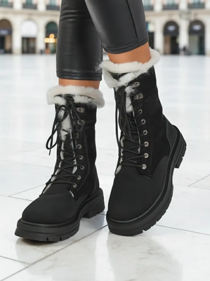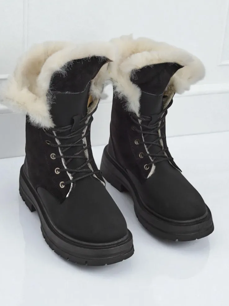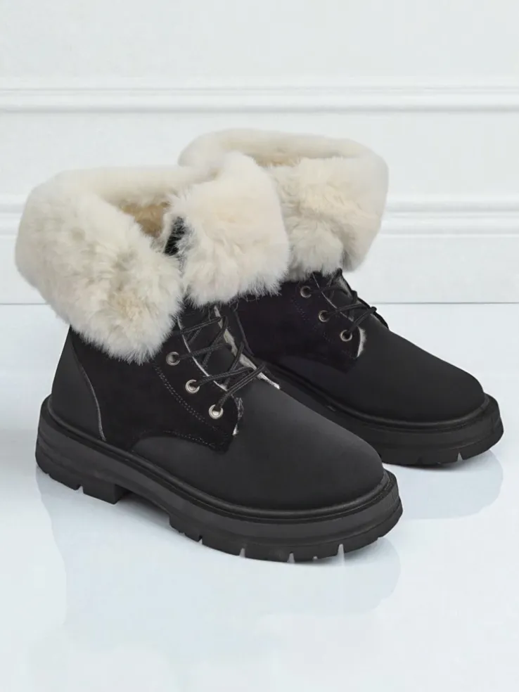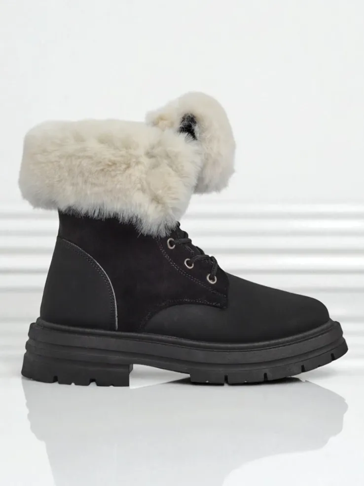- Damskie botki typu trapery ze sznurowaną cholewką wykończoną miękkim futerkiem. Materiał wykonania to skóra ekologiczna matowa i zamszowa. Środek butów jest ocieplany. Idealne na zimowy czas!