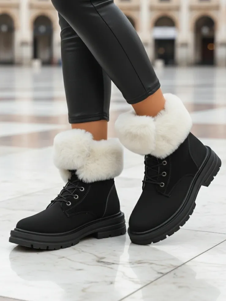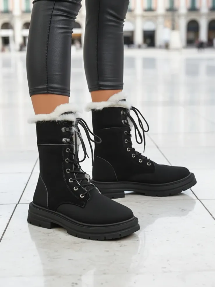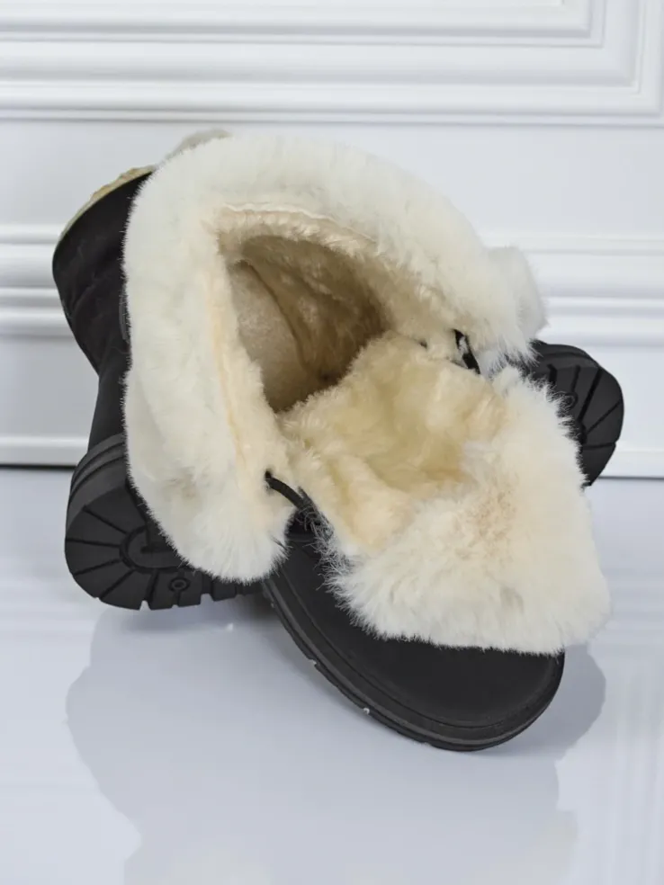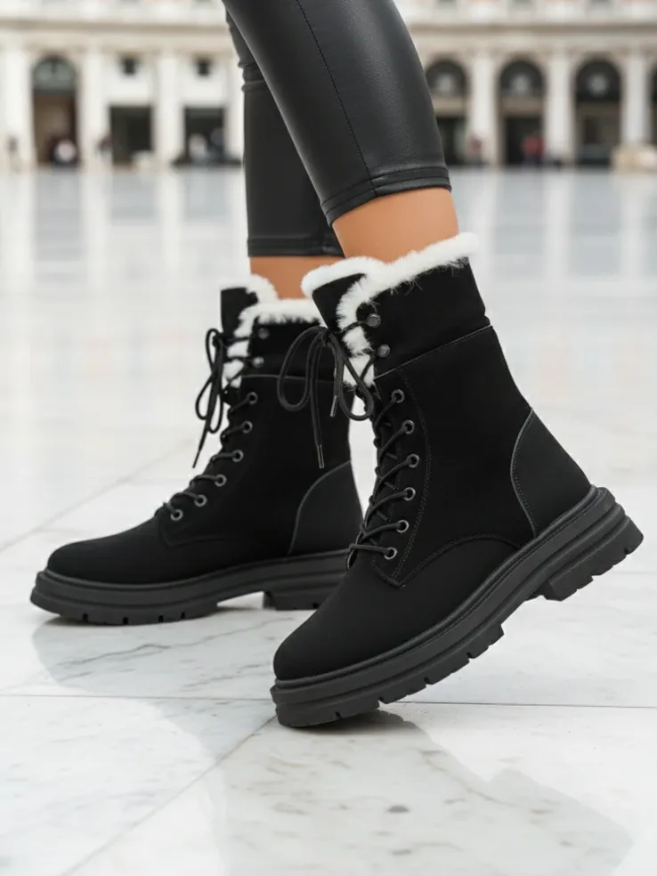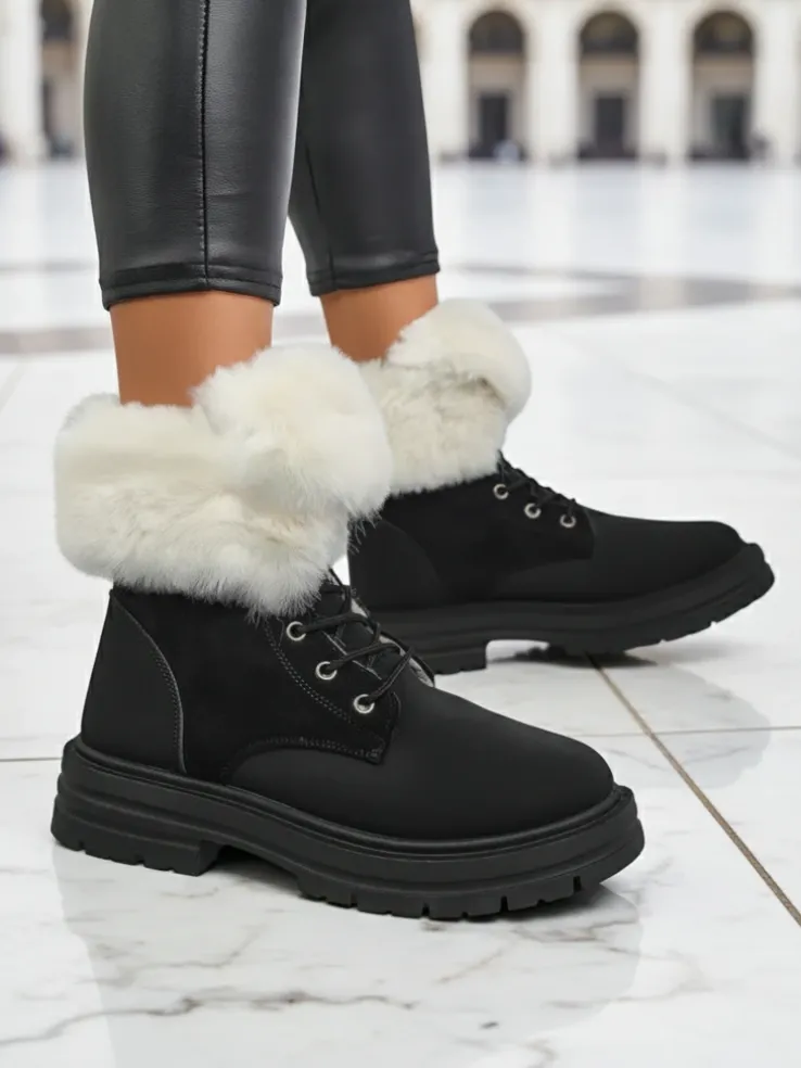 - Damskie botki typu trapery ze sznurowaną cholewką wykończoną miękkim futerkiem. Materiał wykonania to skóra ekologiczna matowa i zamszowa. Środek butów jest ocieplany. Idealne na zimowy czas!