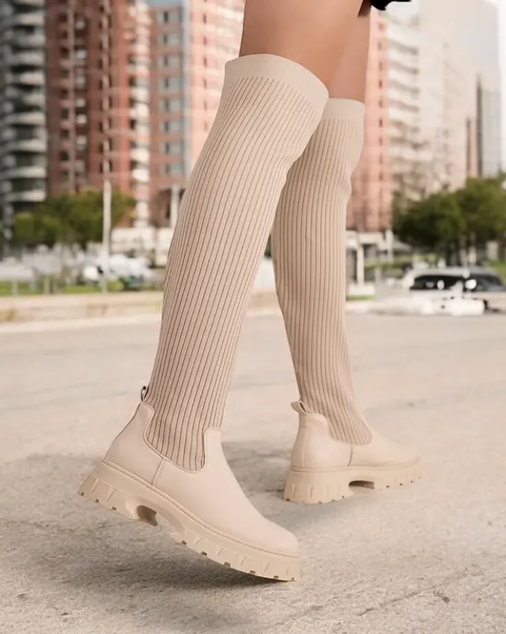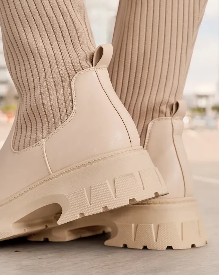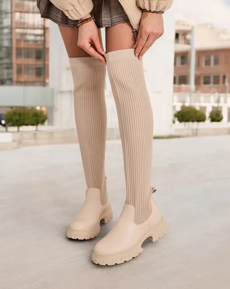 - Stylowe damskie kozaki na platformie. Cholewka wykonana jest z elastycznego materiału tkaninowego, w środku tkaninowa wkładka. Model wsuwany. Idealne do codziennych jesiennych outfitów!