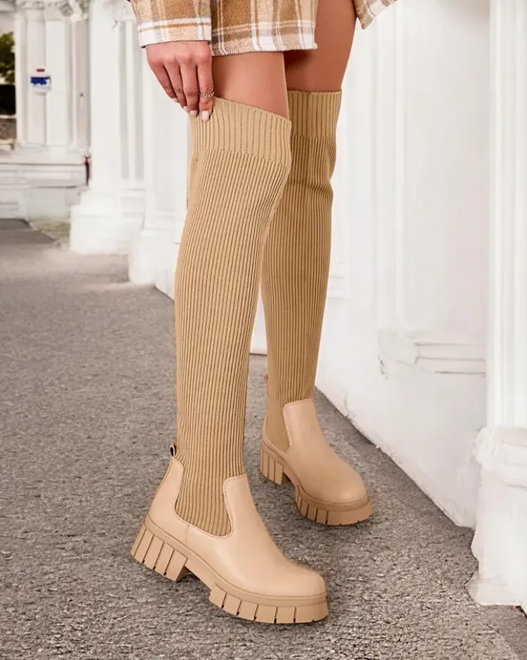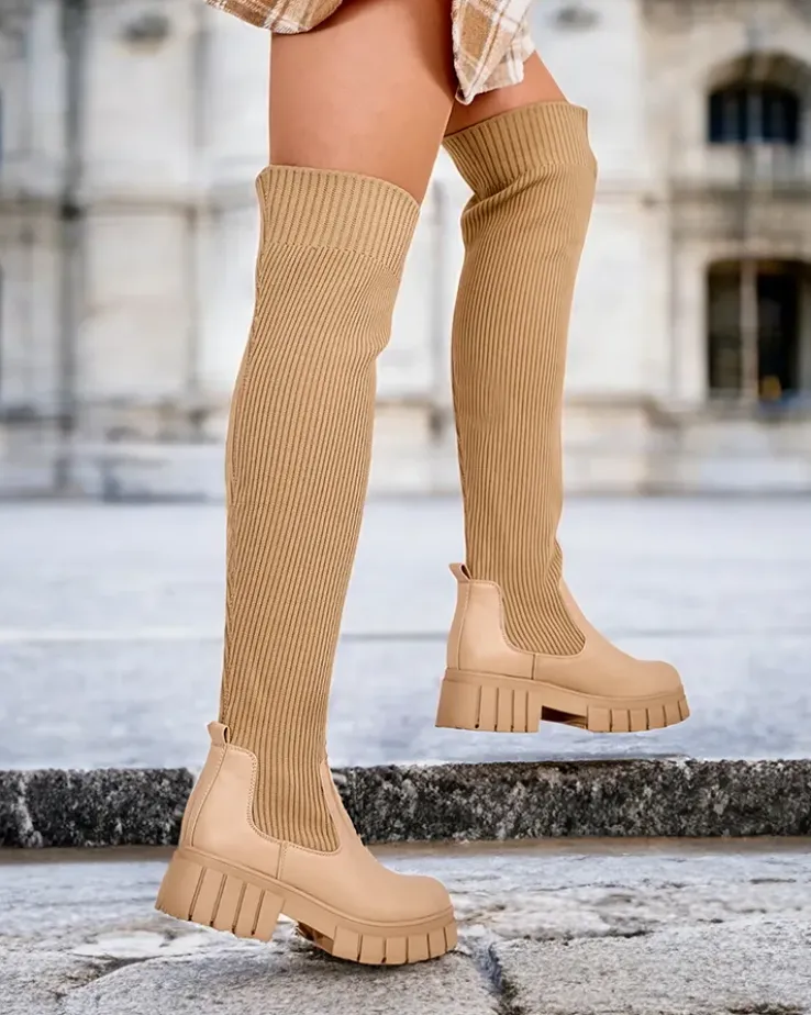 - Stylowe damskie kozaki za kolano na słupku. Cholewka wykonana jest z elastycznego materiału tkaninowego, w środku tkaninowa wkładka. Model wsuwany. Idealne do codziennych jesiennych outfitów!