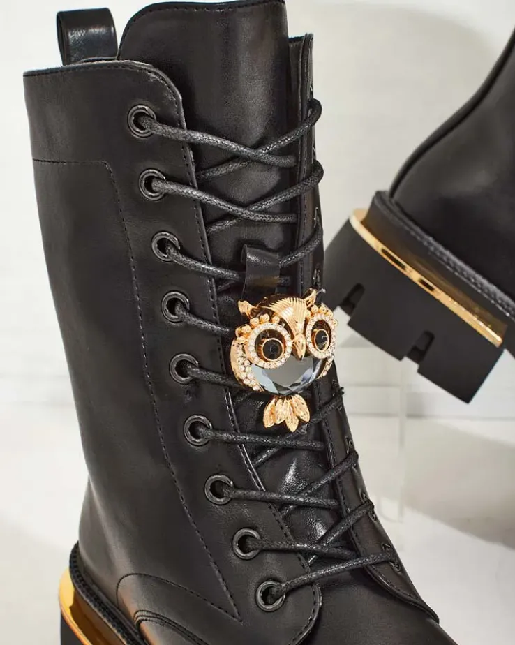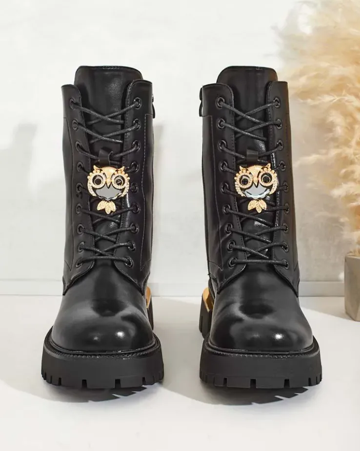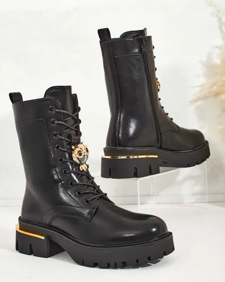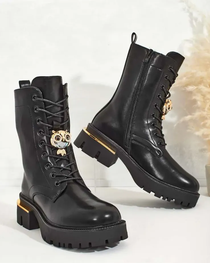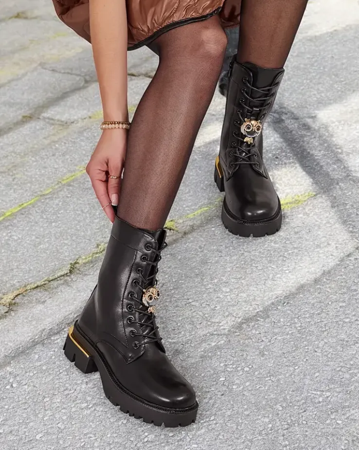 - Stylowe botki typu workery wykonane z eko-skóry. Buty są sznurowane oraz zapinane na suwak, posiadają grubszą, gumową podeszwę oraz futerkową wkładkę. Obuwie posiada ozdobną cholewkę. Idealne na jesień!