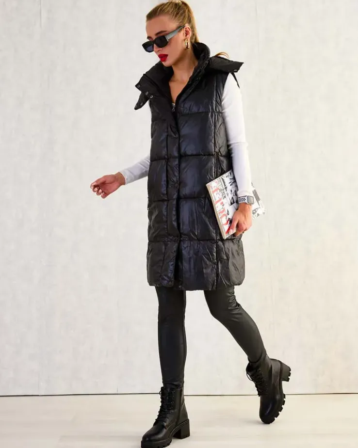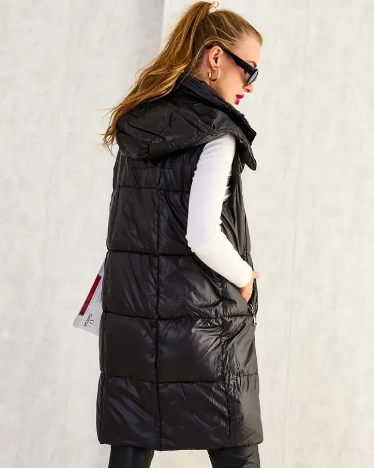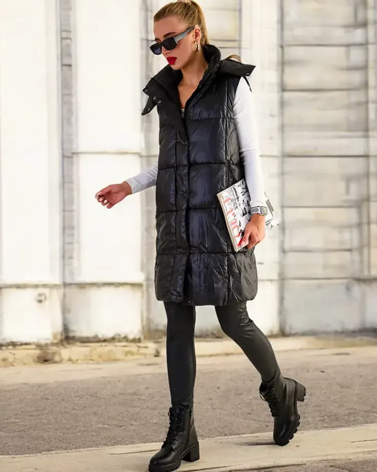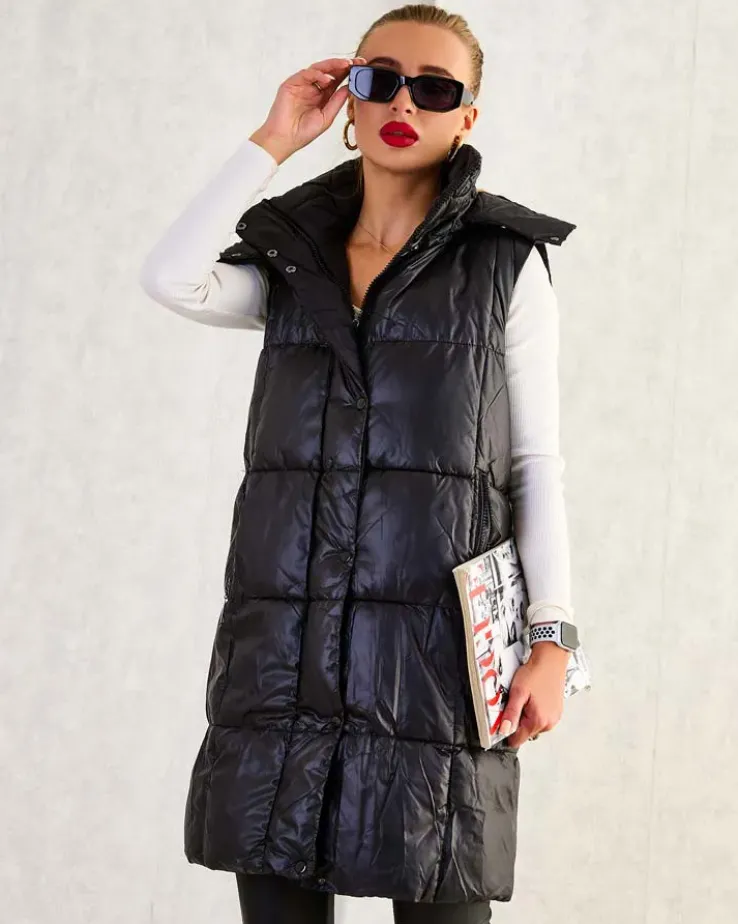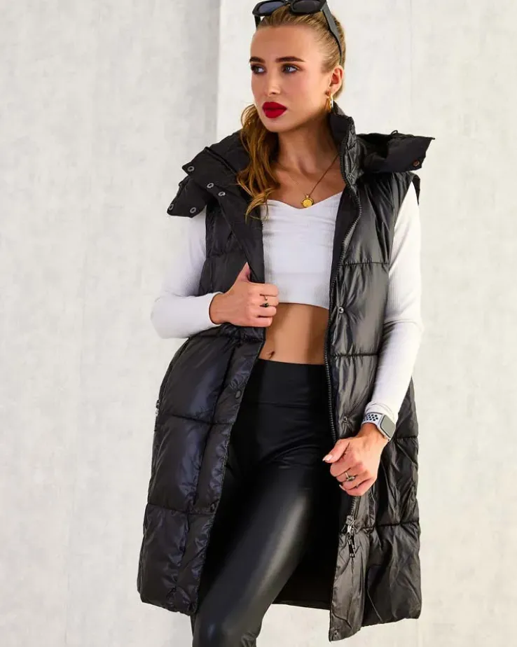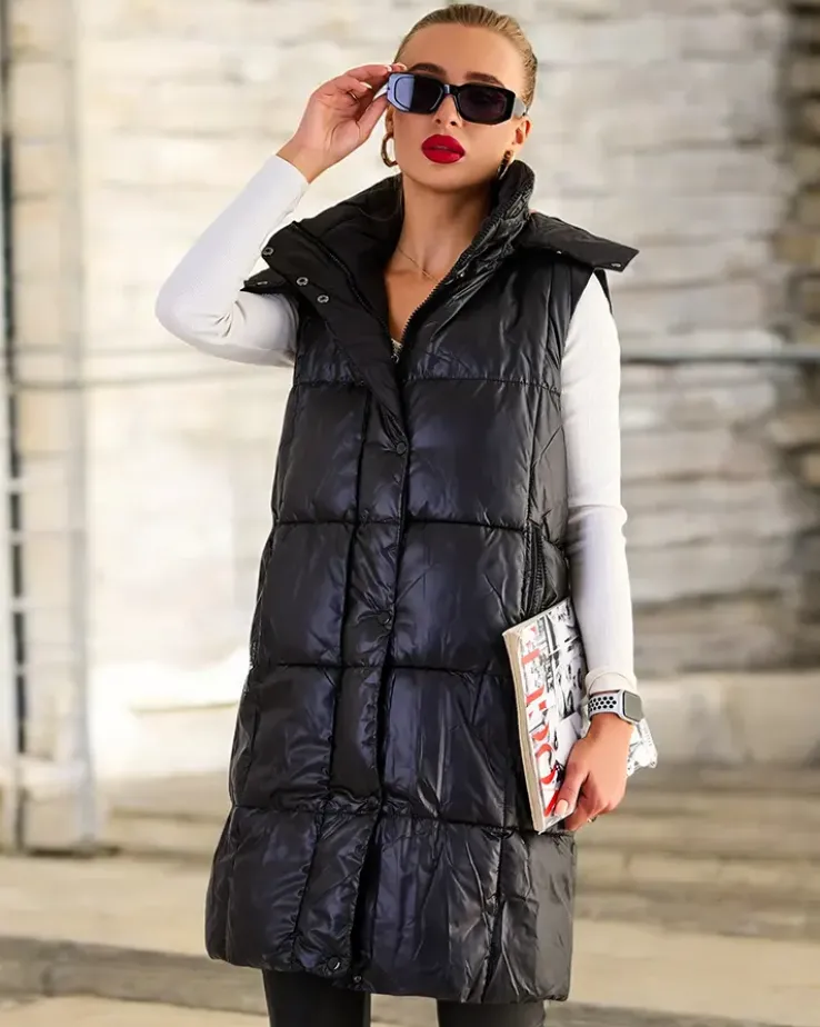 - Przepiękna długa kamizelka damska z poziomymi przeszyciami – idealna na jesienną porę. Bezrękawnik zapinany suwakiem i zatrzaskami, posiada odpinany kaptur i 2 wsuwane kieszenie. Produkt z wypełnieniem syntetycznym. UWAGA: Dokładność pomiaru (+/-) 1 cm.