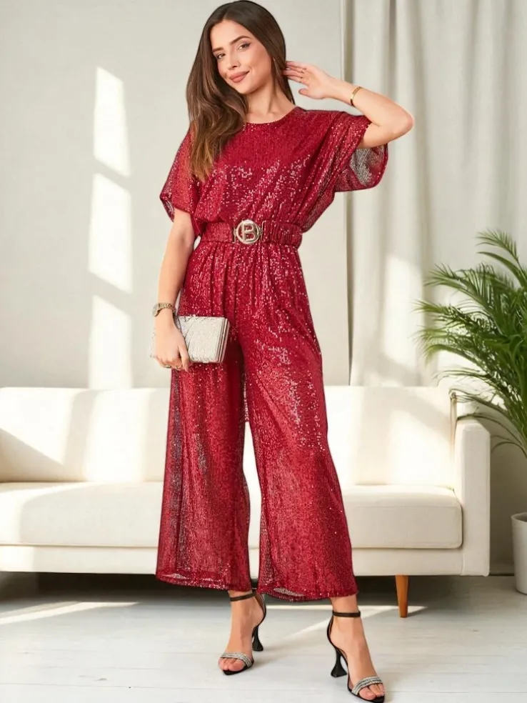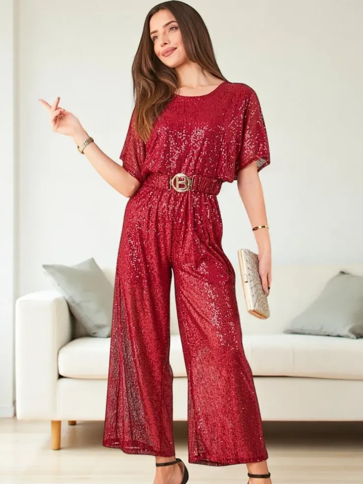 - Rewelacyjny kombinezon damski z krótkimi rękawami, z kopertowym dekoltem oraz gumką w talii. Model posiada proste, długie nogawki. Zdobiony cyrkoniami. Dodatkowo pasek w zestawie. UWAGA: Dokładność pomiaru (+/-) 1 cm.