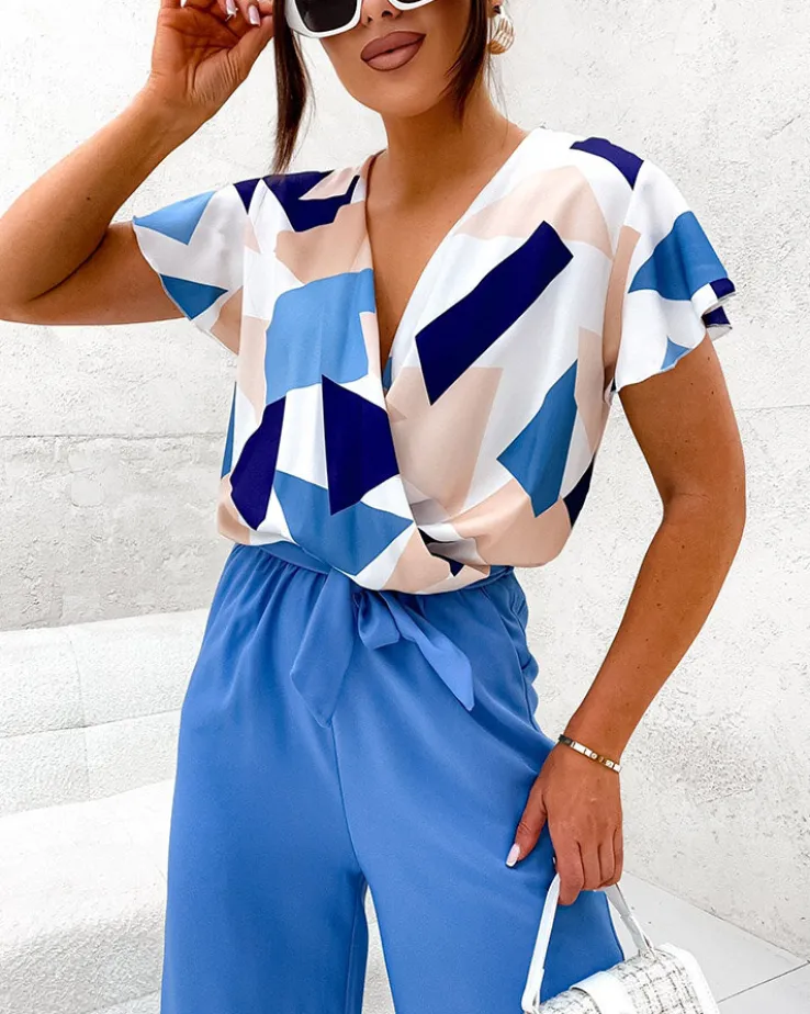- Rewelacyjny kombinezon damski z krótkimi rękawami, dekoltem w serek oraz gumką w talii. Model posiada szerokie, długie nogawki. Dodatkowo pasek w zestawie. UWAGA: Dokładność pomiaru (+/-) 1 cm.