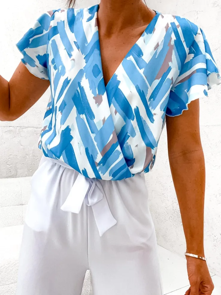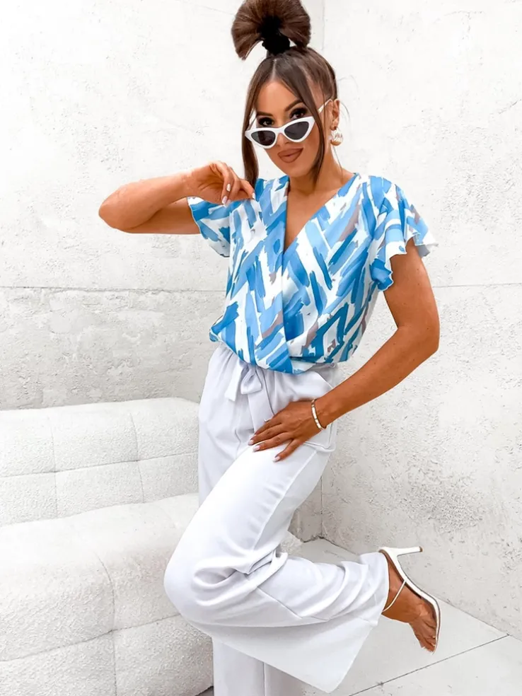 - Rewelacyjny kombinezon damski z krótkimi rękawami, dekoltem w serek oraz gumką w talii. Model posiada szerokie, długie nogawki. Dodatkowo pasek w zestawie. UWAGA: Dokładność pomiaru (+/-) 1 cm.