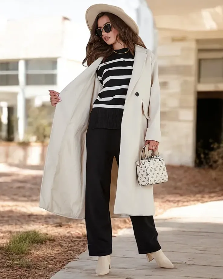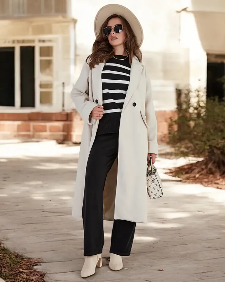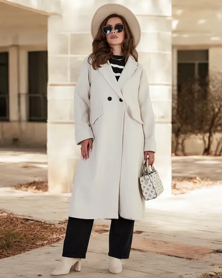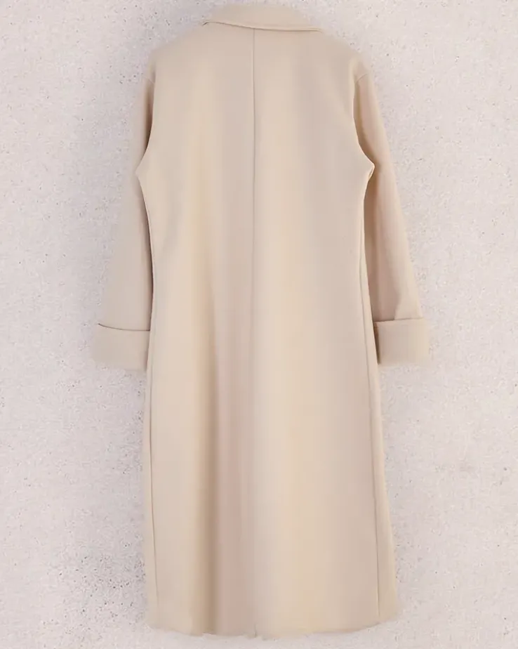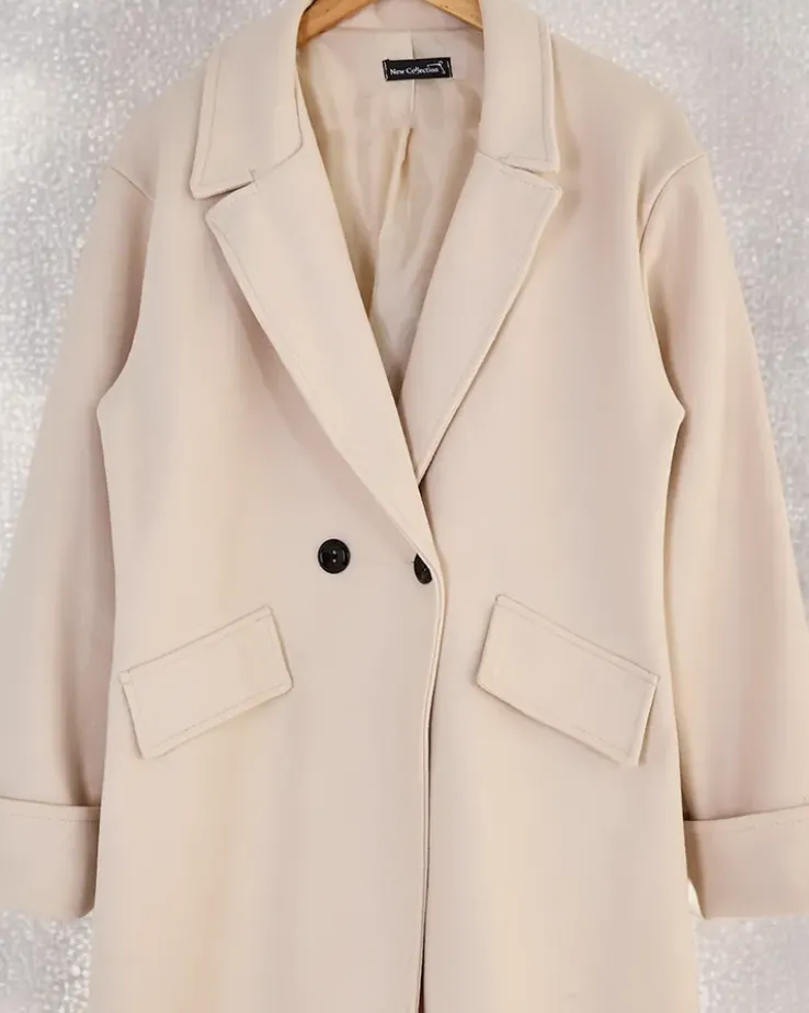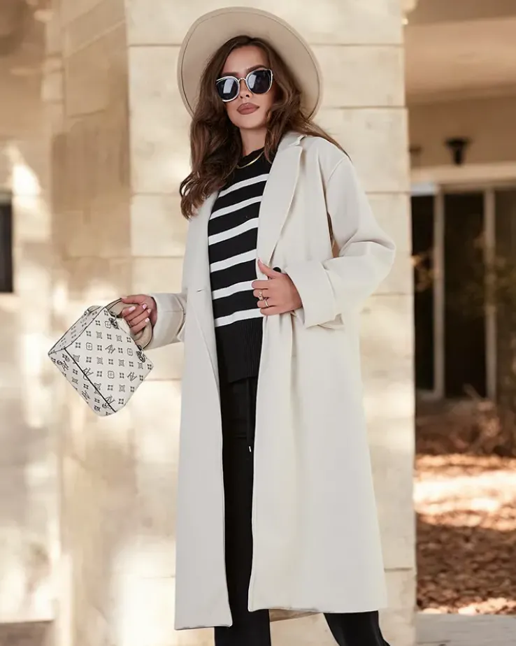 - Długi damski płaszcz z przyjemnego materiału. Model posiada długie rękawy i zapięcie na guziki. Posiada podszewkę. Idealna propozycja na jesień! UWAGA: Dokładność pomiaru (+/-) 1 cm. Wymiary mierzone na płasko.