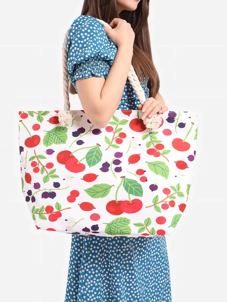 - Stylowa torba materiałowa wykończona printem. Torebka z dłuższymi rączkami, zapinana na zamek, w środku posiada 1 kieszonkę. Nada się świetnie na plażę!