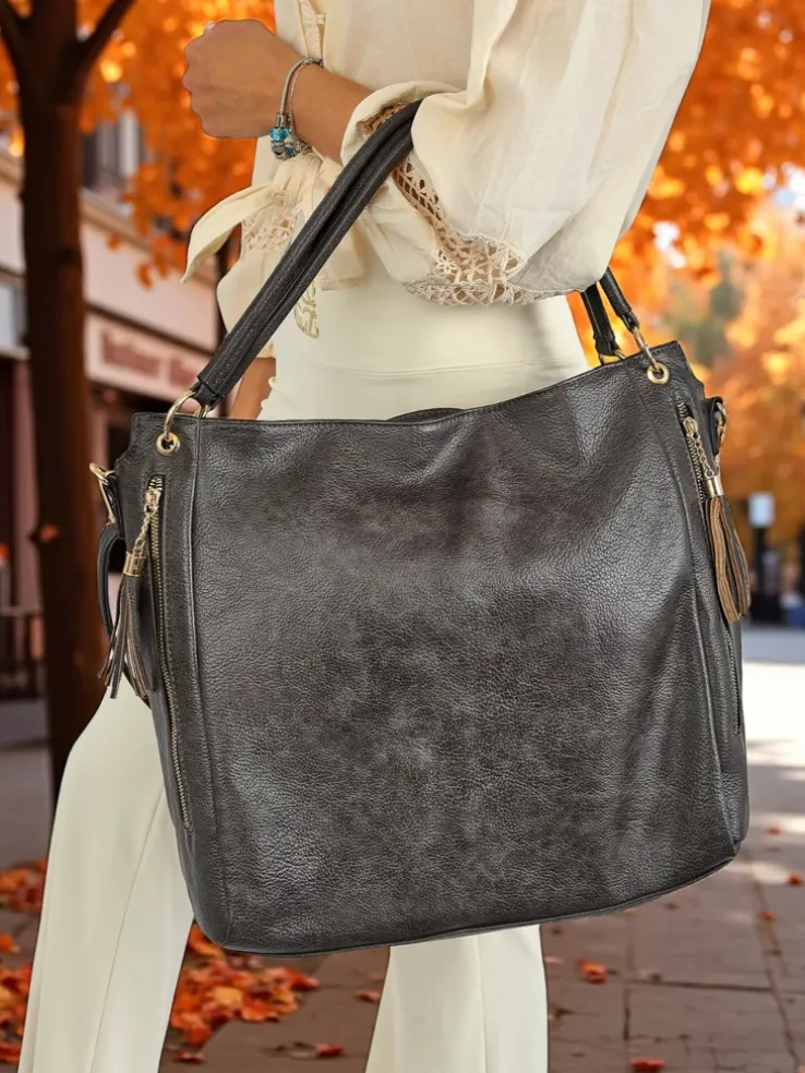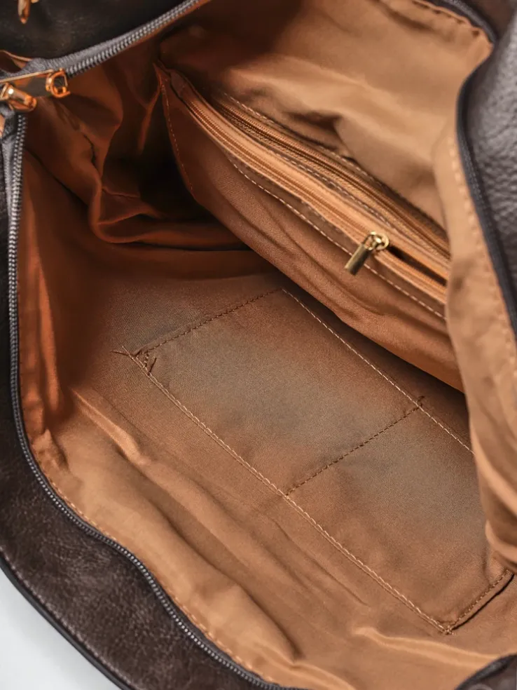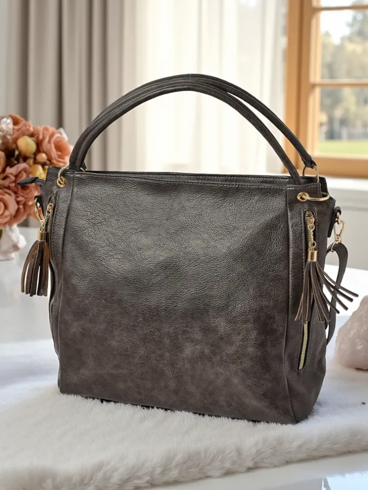 - Stylowa shopperka z eko skóry z 1 komorą, 4 kieszeniami wewnętrznymi i 1 zewnętrzną. Ozdobne boczne kieszonki na suwak z frędzelkami dodają charakteru. Z odpinanym, regulowanym paskiem – idealna na co dzień.