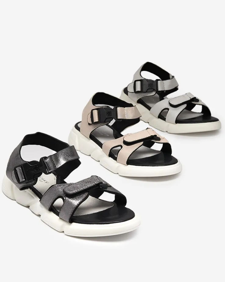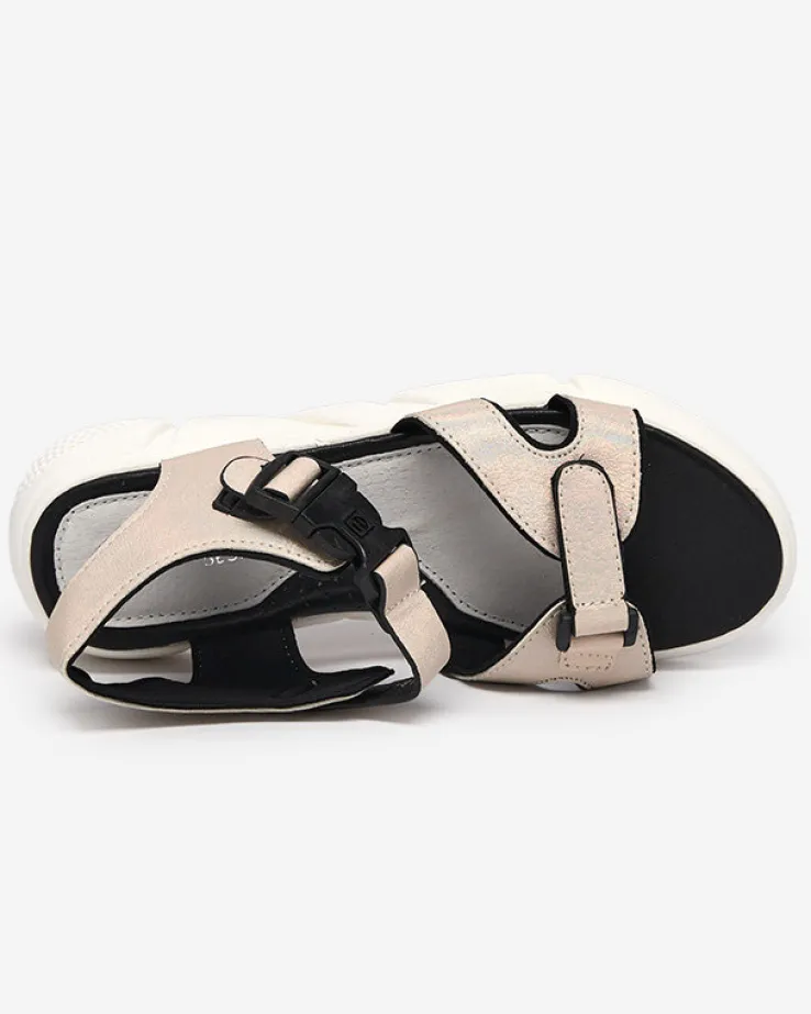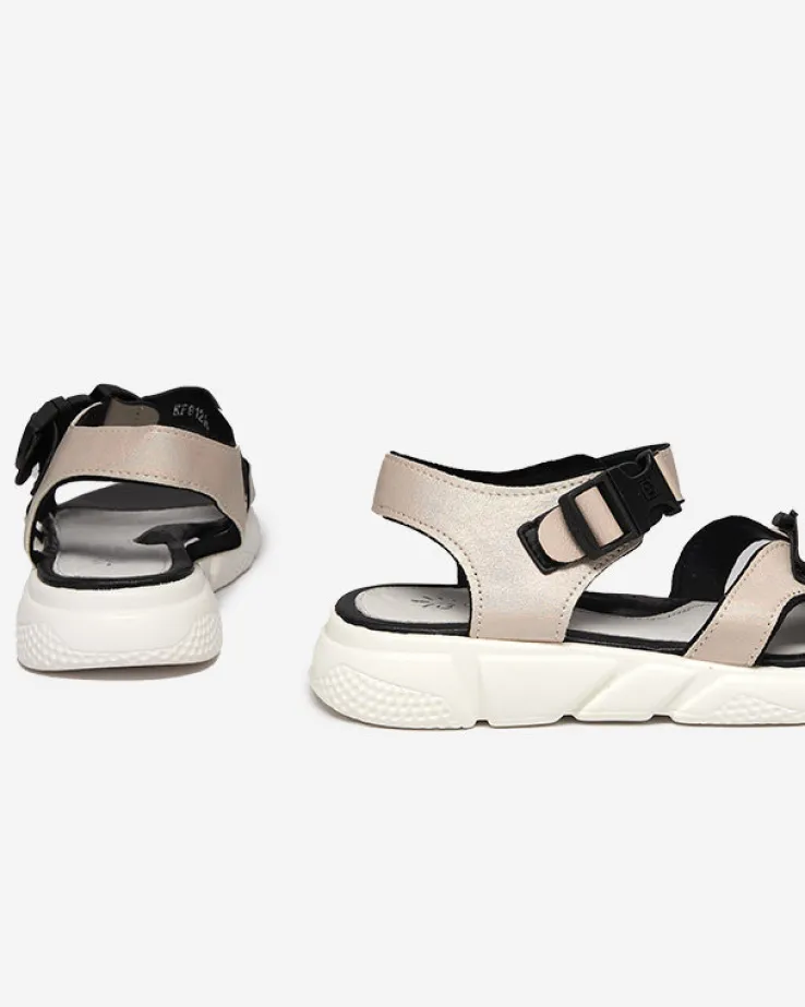 - Wyjątkowe dziewczęce sandały wykonane z błyszczącej tkaniny. Obuwie zapinane na klamrę wokół kostki oraz na rzep przy palcach. W środku miękka, eko skórzana wkładka. Sprawdzą się na co dzień!