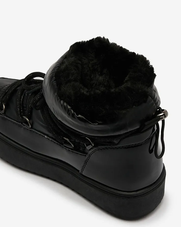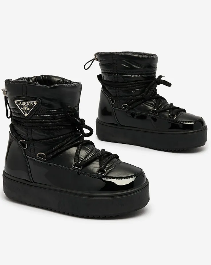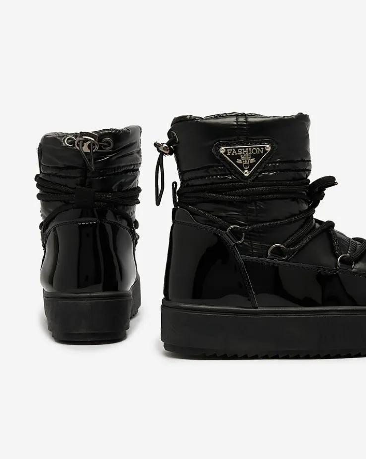 - Przepiękne dziecięce wsuwane obuwie typu śniegowce. Cholewka jest wykonana ze skóry ekologicznej lakierowanej oraz materiału sztucznego a’la cerata. Środek jest ocieplony grubym futerkiem. Obuwie posiada ściągacz na górze cholewki i ozdobne sznurowanie.