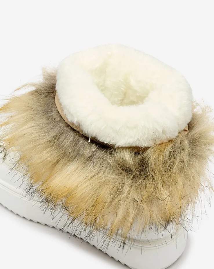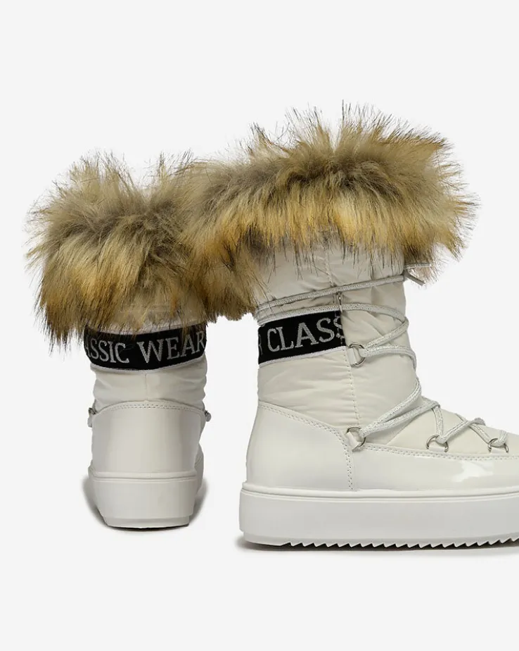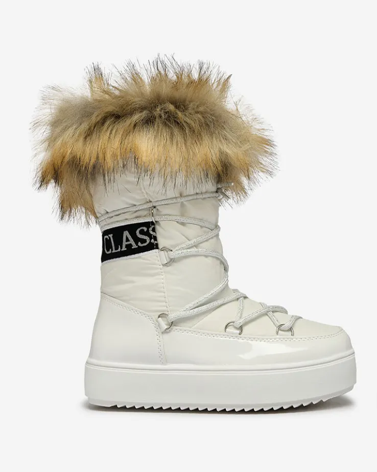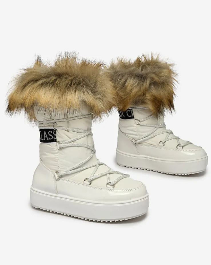 - Przepiękne dziecięce wsuwane obuwie typu śniegowce z futerkiem. Cholewka jest wykonana z eko-skóry lakierowanej oraz materiału sztucznego a’la cerata. Środek jest ocieplony grubym futerkiem. Obuwie jest zdobione sznurowaniem.