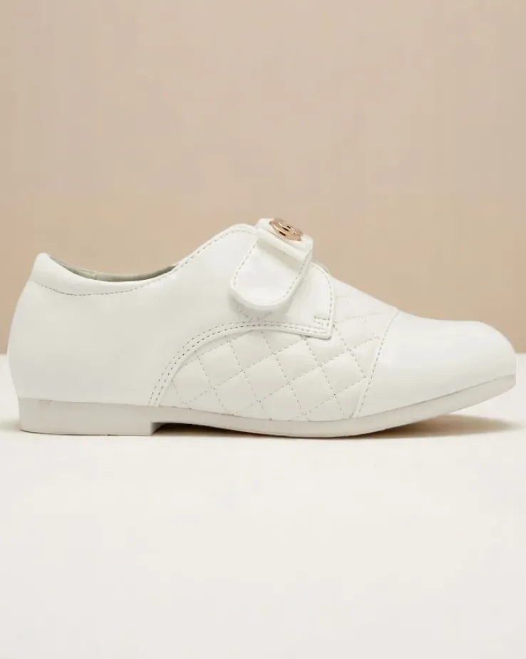 - Dziewczęce pikowane półbuty wykonane ze skóry ekologicznej z lakierowanymi wstawkami. Obuwie zapinane na rzep, a w środku posiada miękką wkładkę z poduszeczkami ze skóry naturalnej. Idealnie się sprawdzą na co dzień!