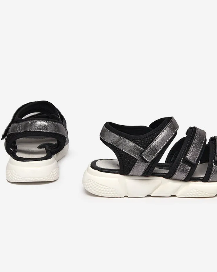 - Klasyczne dziewczęce sandałki wykonane ze skóry ekologicznej z błyszczącym wykończeniem. Wkładka również eko skórzana. Szerokość obuwia można regulować za pomocą rzep. Doskonale sprawdzą się na co dzień!