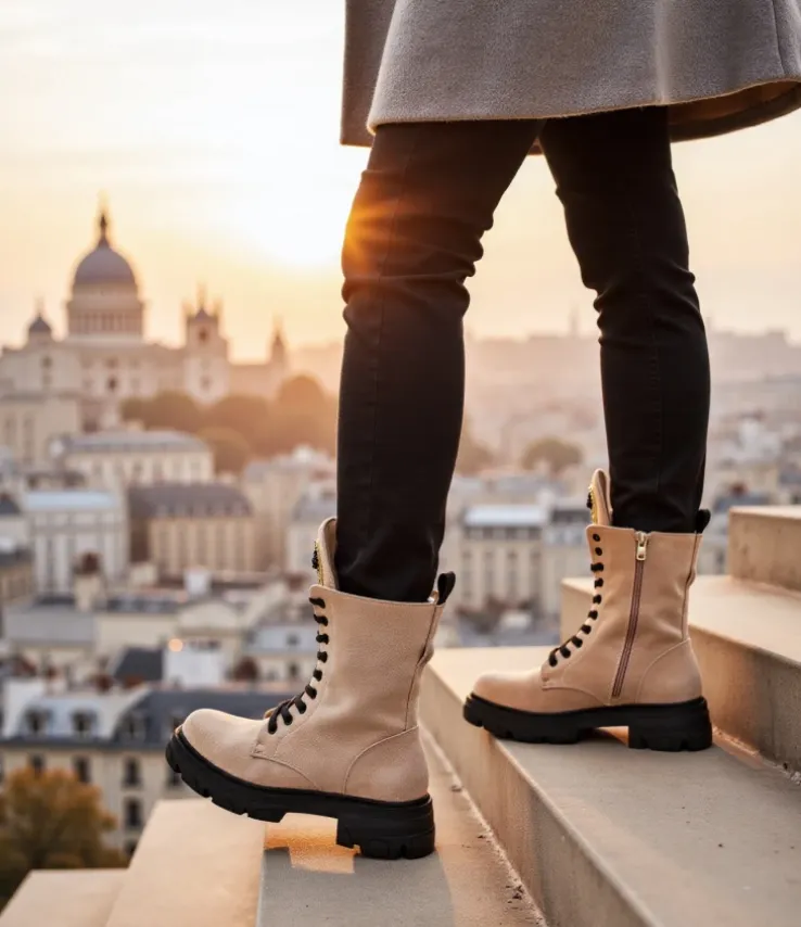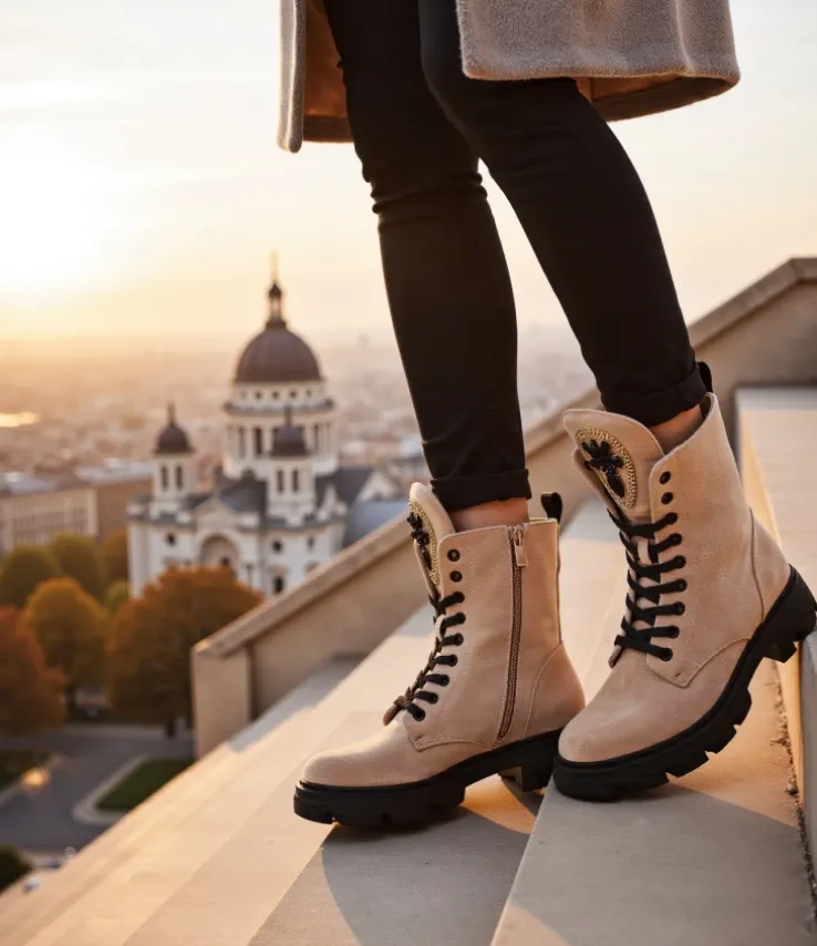 - Wysokie botki typu workery damskie z eko-zamszu, sznurowane oraz zapinane na suwak. Dodatkowo ozdobne kamyczki na języku. Model na wyższej podeszwie, w środku tkanina. Idealny wybór na chłodniejszy czas!
