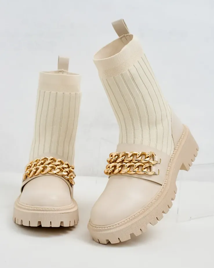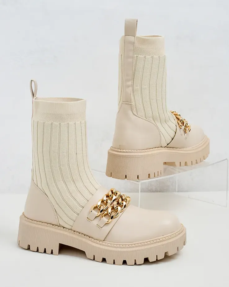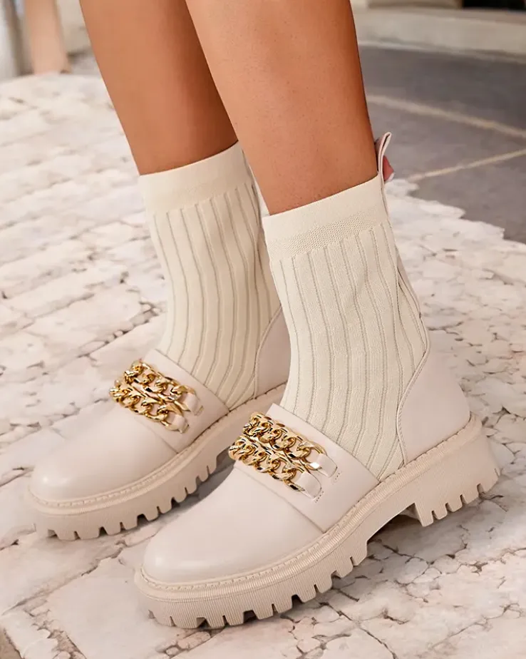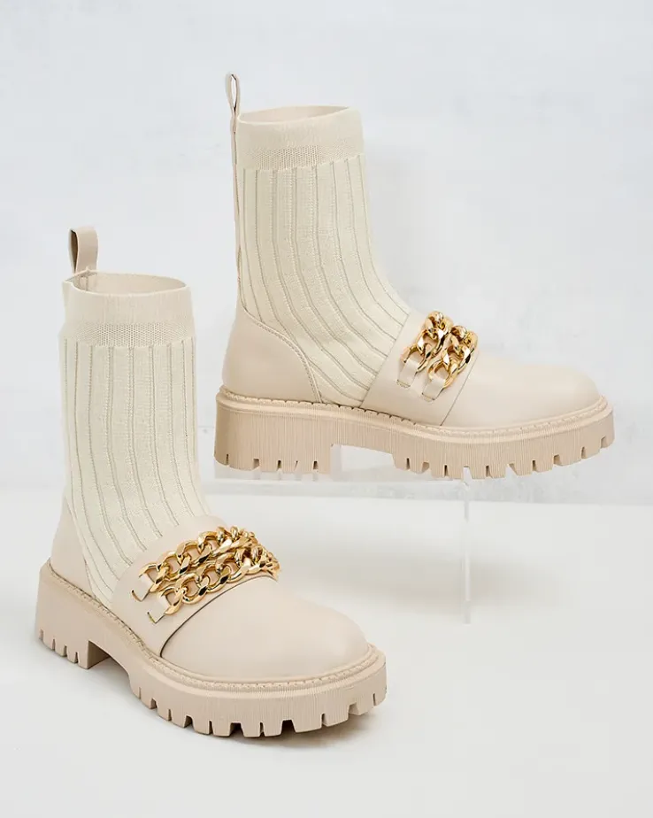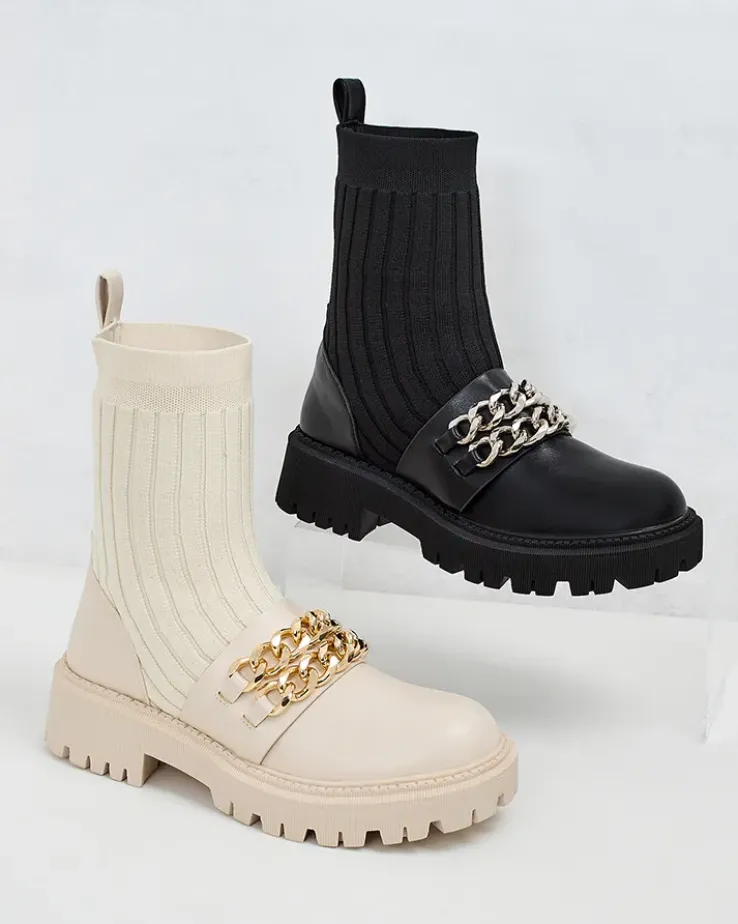 - Botki na płaskiej podeszwie- styl i wygoda w jednym. Model wsuwany, wykonane z połączenia eko skóry i tkaniny, wkładka to delikatne futerko. Model zdobiony łańcuszkami przy nosku, doda Ci pewności siebie!