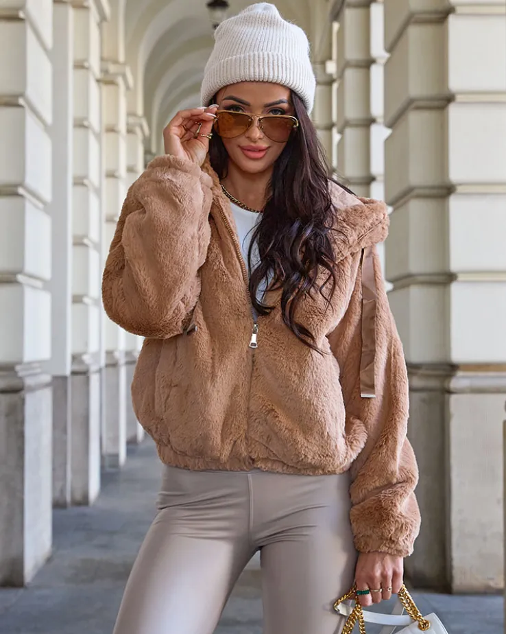 - Wyjątkowa kurtka damska wykonana z przyjemnego, miękkiego materiału a’la futerko. Model posiada kaptur, 2 kieszenie oraz jest zapinany na suwak. Hit tego sezonu!