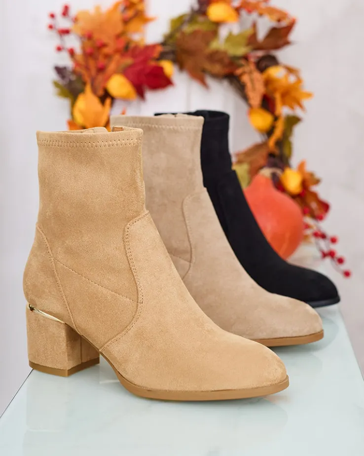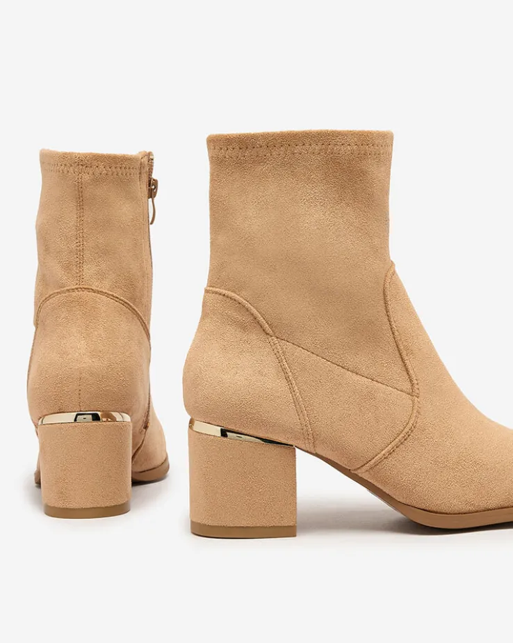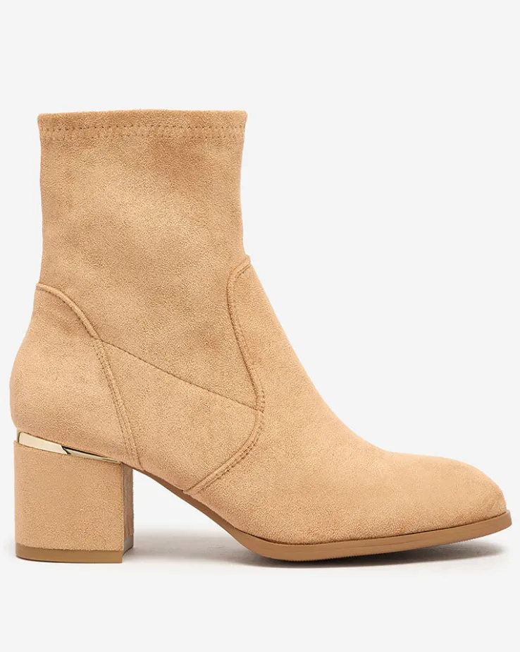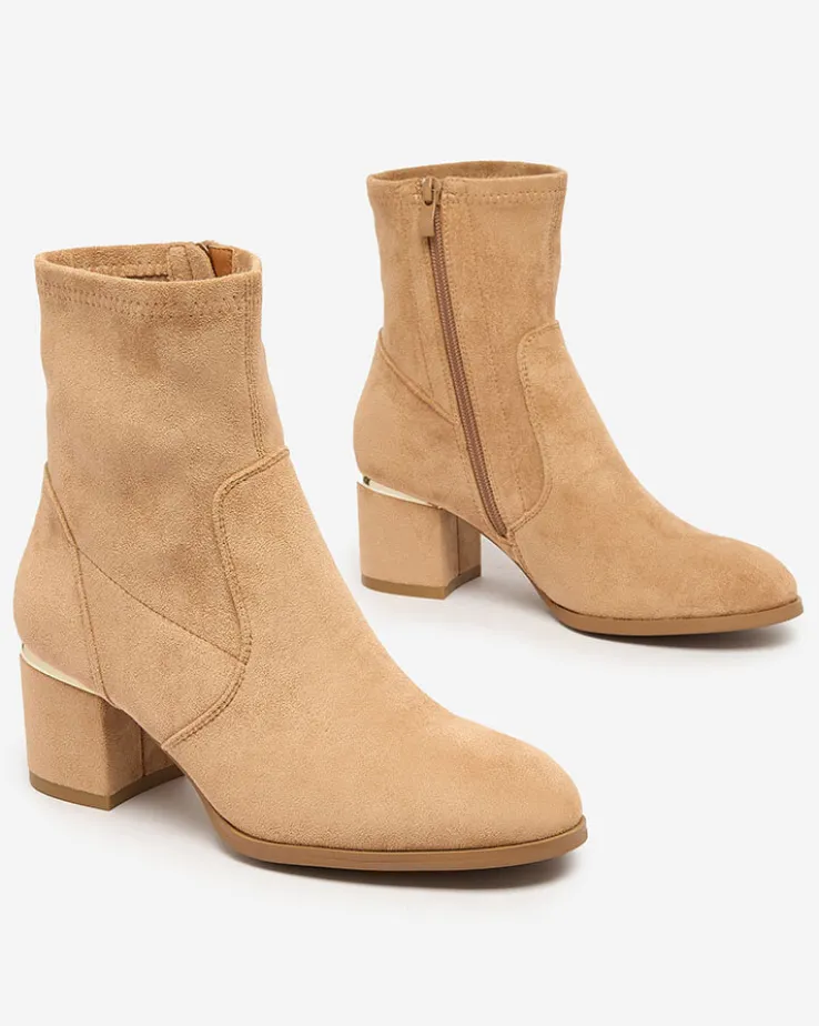 - Stylowe damskie botki na niskim słupku. Cholewka wykonana ze skóry ekologicznej zamszowej, wkładka z materiału a’la futerko. Obuwie jest zapinane na suwak. Świetny wybór na jesień!