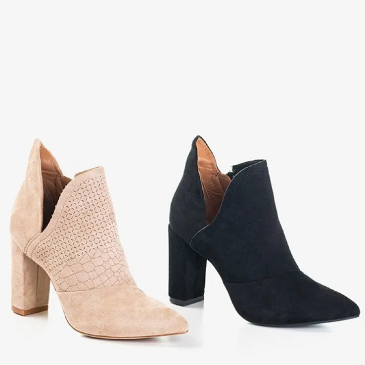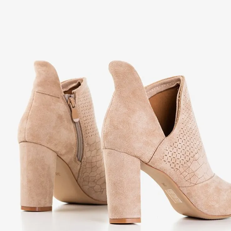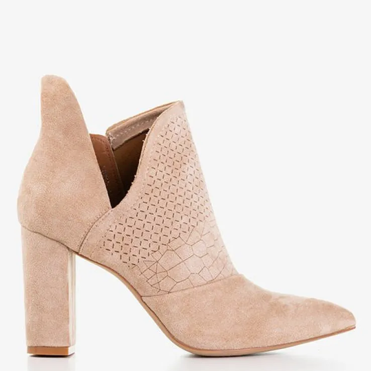 - Eleganckie damskie botki w kolorze jasnobrązowym na wyższym słupku. Model wykonany ze skóry ekologicznej zamszowej. Cholewka z wycięciem, zapinana suwakiem po boku, zdobiona geometrycznymi wzorkami. Wkładka tkaninowa. Idealne na jesień!