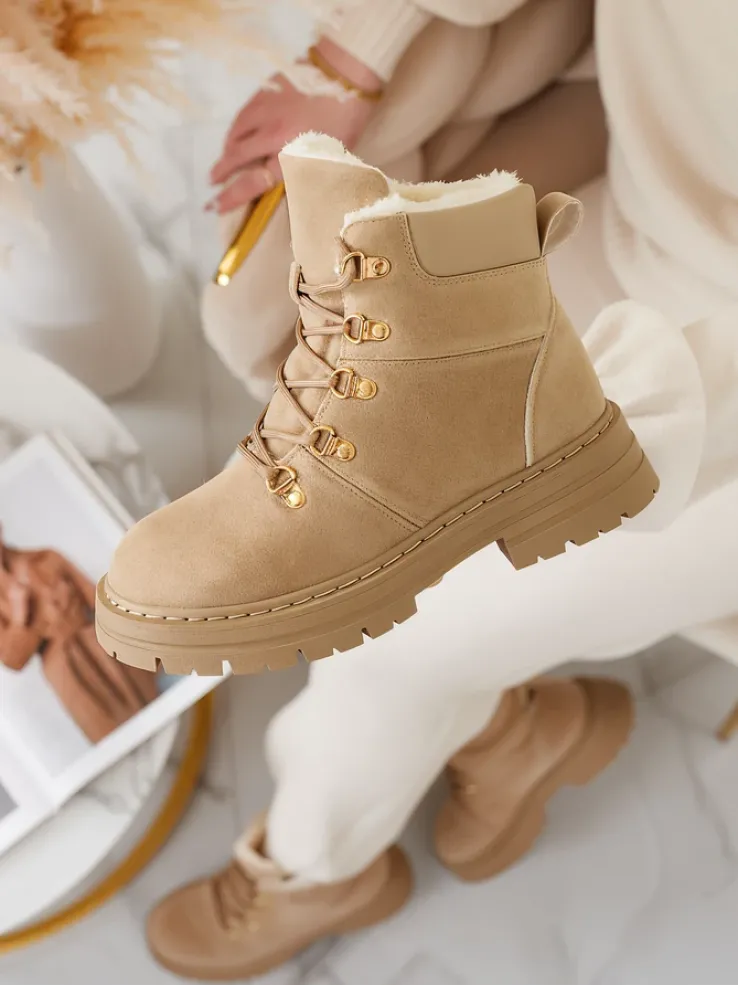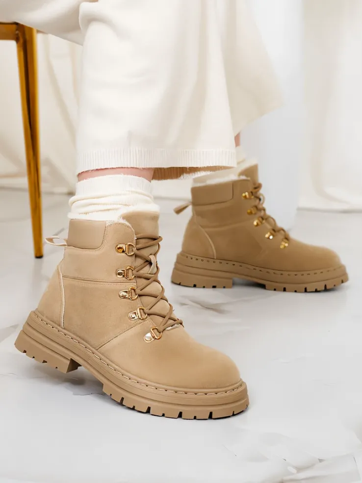 - Ocieplane trapery damskie, wykonane z eko nubuku. Cholewka wiązana, w środku ocieplenie w formie futerka. Konkretne buty na złą pogodę!