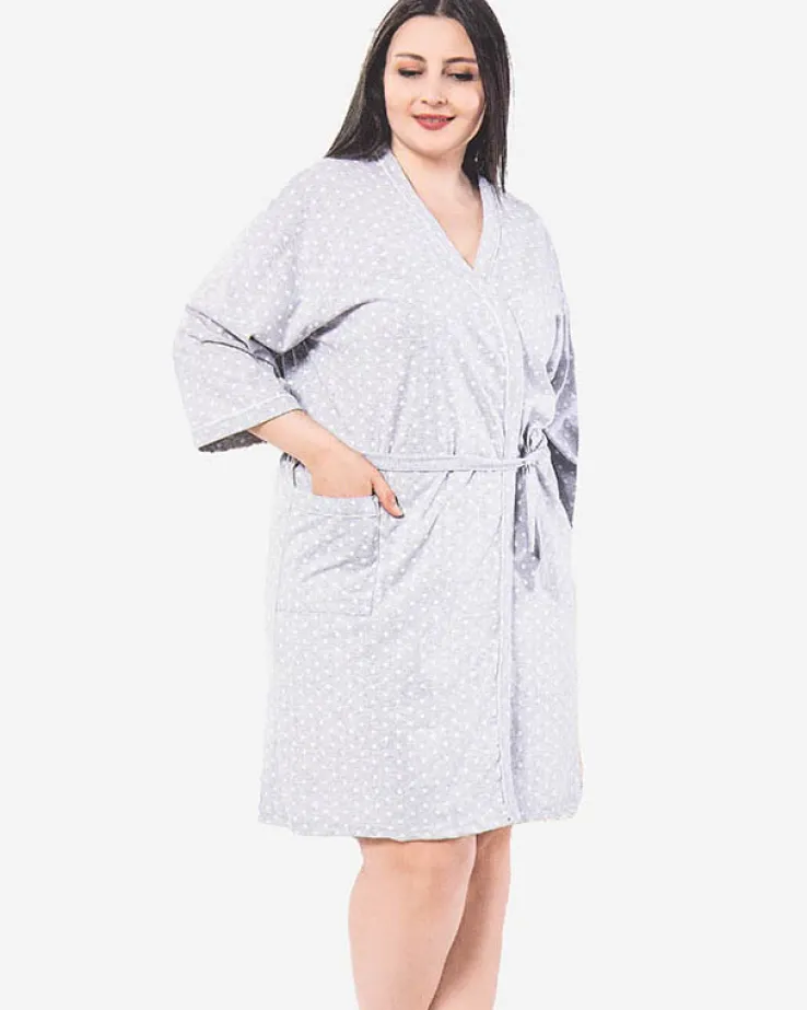 - Lekki damski szlafrok wykonany z miękkiej 100% bawełny. Model posiada szeroki kopertowy dekolt oraz rękawy o długości 3/4. Wygody dodaje duża wsuwana kieszeń po boku i pasek wiązany w talii.